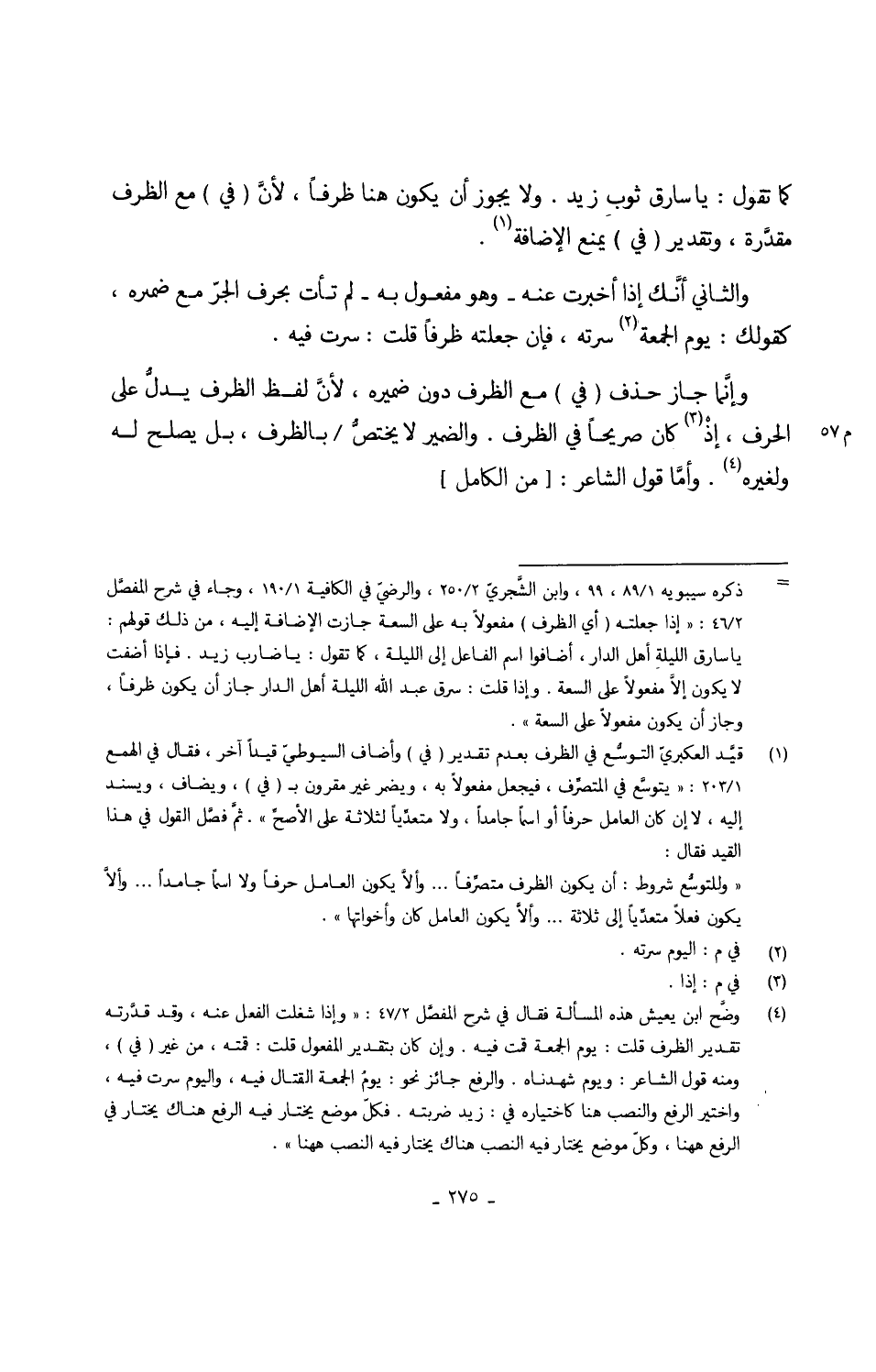 وإنَّما جَازَ حذف (فِي) مَعَ الظّرْف دون ضَمِيره لأنَّ لفظ الظّرْف يدلُّ على الْحَرْف إِذْ كَانَ صَرِيحًا فِي الظّرْف وَالضَّمِير لَا يختصُّ بالظرف بل يصلح لَهُ وَلغيره وأمّا قَول الشَّاعِر