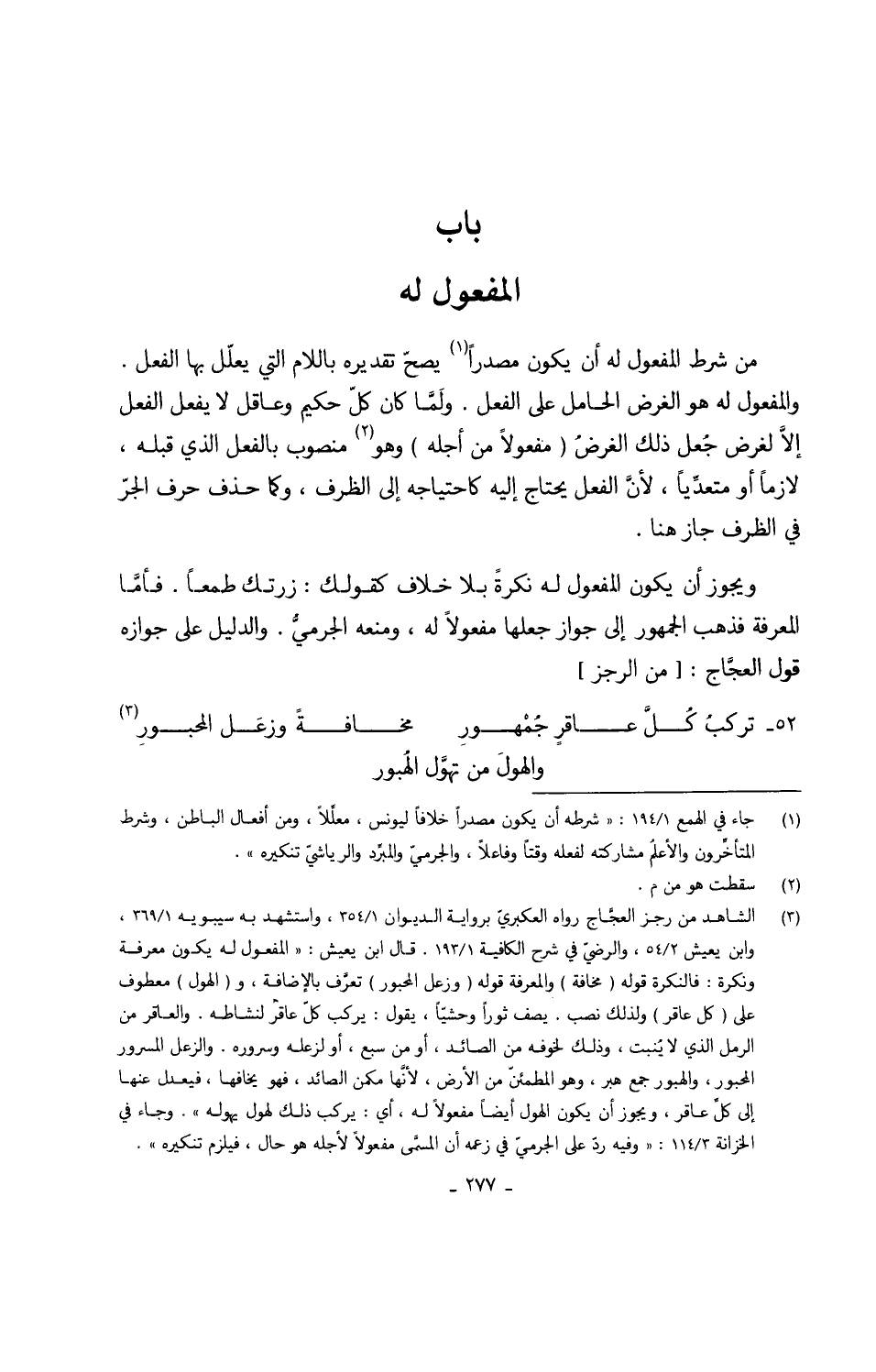 من شَرط الْمَفْعُول لَهُ أَن يكون مصدرا يصحّ تَقْدِيره بِاللَّامِ الَّتِي يعلّل بهَا الْفِعْل وَالْمَفْعُول لَهُ هُوَ الْغَرَض الْحَامِل على الْفِعْل ولّمَّا كَانَ كّل حَكِيم وعاقل لَا يفعل الْفِعْل إلاَّ لغَرَض جُعلُ ذَلِك الغرضُ (مَفْعُولا من أَجله) وَهُوَ مَنْصُوب بِالْفِعْلِ الَّذِي قبله لازماَ أَو متعديِّا لأنَّ الْفِعْل يحْتَاج إِلَيْهِ كاحتياجه إِلَى الظّرْف وكما حذف حرف الجرّ فِي الظّرْف جَازَ هُنَا وَيجوز أَن يكون الْمَفْعُول لَهُ نكرَة بِلَا خلاف كَقَوْلِك زرتك طَمَعا فأمَّا الْمعرفَة فَذهب الْجُمْهُور إِلَى جَوَاز جعلهَا مَفْعُولا لَهُ وَمنعه الجرميُّ وَالدَّلِيل على جَوَازه قَول العجَّاج 52 -