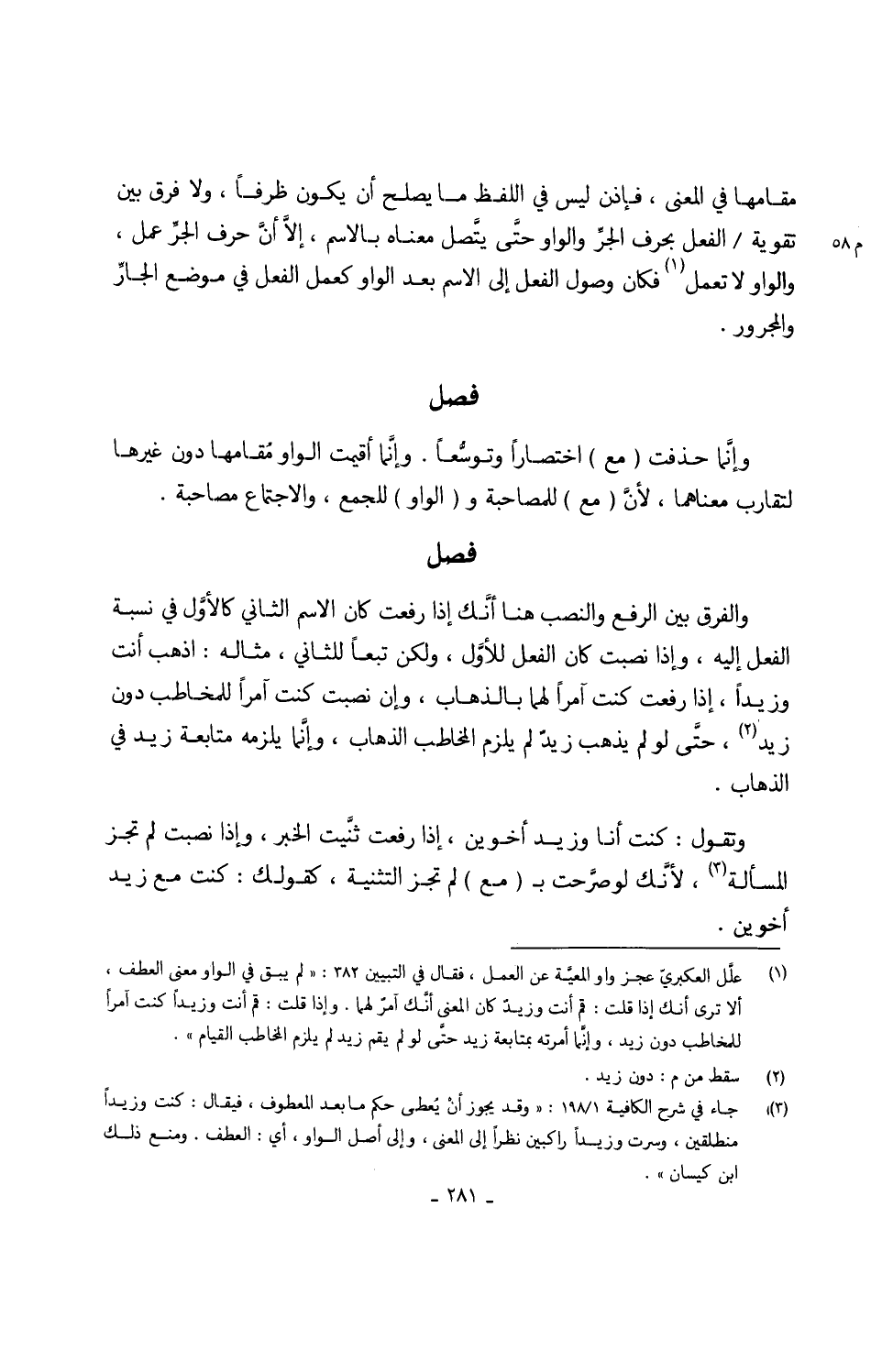 وإنَّما حذفت (مَعَ) اختصاراً وتوسُّعاً وإنَّما أُقِيمَت مُقامها دون غَيرهَا لتقارب مَعْنَاهُمَا لأنَّ (مَعَ) للمصاحبة و (الْوَاو) للْجمع والاجتماع مصاحبة