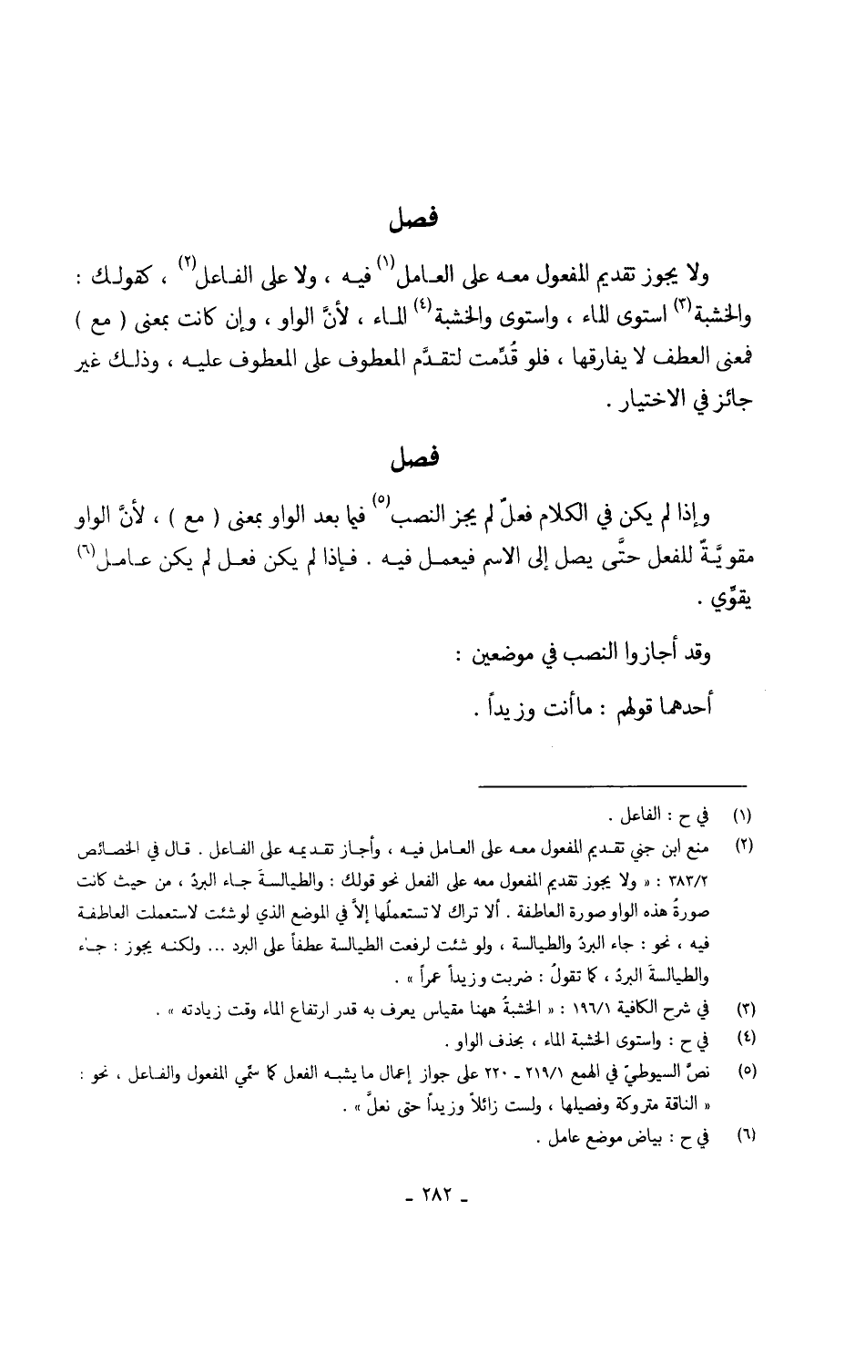 ولايجوز تَقْدِيم الْمَفْعُول مَعَه على الْعَامِل فِيهِ وَلَا على الْفَاعِل كَقَوْلِك والخشبة اسْتَوَى المَاء واستوى والخشبة المَاء وإنَّ الْوَاو ولإنَّ كَانَت بِمَعْنى (مَعَ) فَمَعْنَى الْعَطف لَا يفارقها فَلَو قُدِّمت لتقدَّم الْمَعْطُوف على الْمَعْطُوف عَلَيْهِ وَذَلِكَ غير جَائِز فِي الِاخْتِيَار