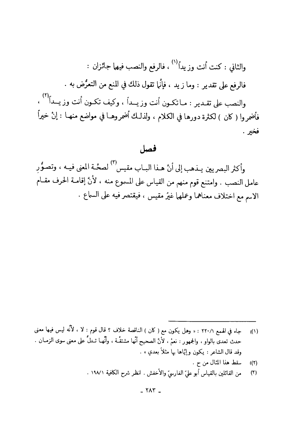 وَأكْثر الْبَصرِيين يذهب إِلَى أنَّ هَذَا الْبَاب مقيس لصحَّة الْمَعْنى فِيهِ وتصوُّر عَامل النصب وَامْتنع قوم مِنْهُم من الْقيَاس على المسموع مِنْهُ لأنَّ إِقَامَة الْحَرْف مقَام الِاسْم مَعَ اخْتِلَاف مَعْنَاهُمَا وعملهما غيرُ مقيُس فَيقْتَصر فِيهِ على السماع