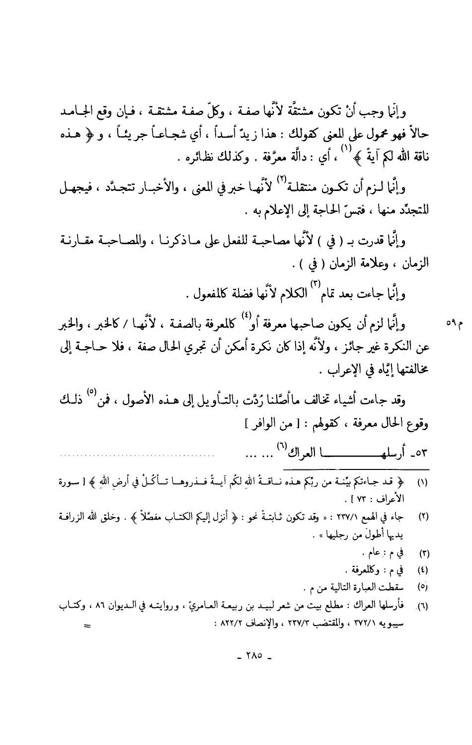 وإنَّما وَجب أنْ تكون مشتقَّة لأنَّها صفة وكلّ صفة مُشْتَقَّة فإنَّ وَقع الجامد حَالا فَهُوَ مَحْمُول على الْمَعْنى كَقَوْلِك هَذَا زيدٌ أسداً أَي شجاعاً جزئياً و {هَذِه نَاقَة الله لكم آيَة} أَي دالَّة معَّرفة وَكَذَلِكَ نَظَائِره