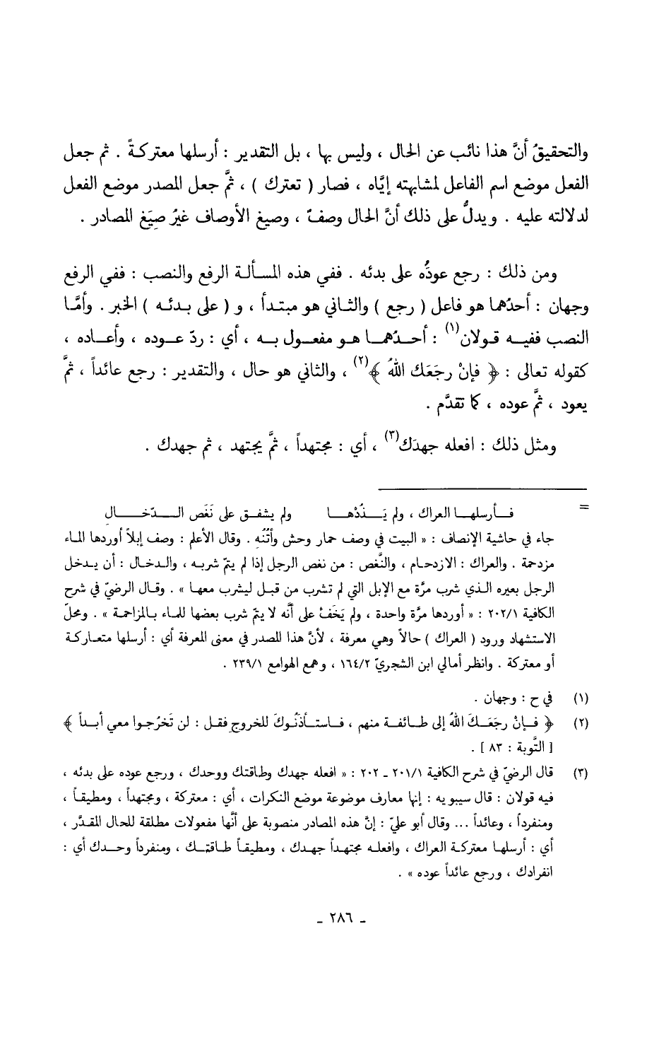 وَالثَّانِي هُوَ حَال وَالتَّقْدِير رَجَعَ عَائِدًا ثمَّ يعود ثَّم عوده كَمَا تقدَّم وَمثل ذَلِك افعله جهدك أَي مُجْتَهدا ثَّم يجْتَهد قثَّم ثمَّ جهدك
