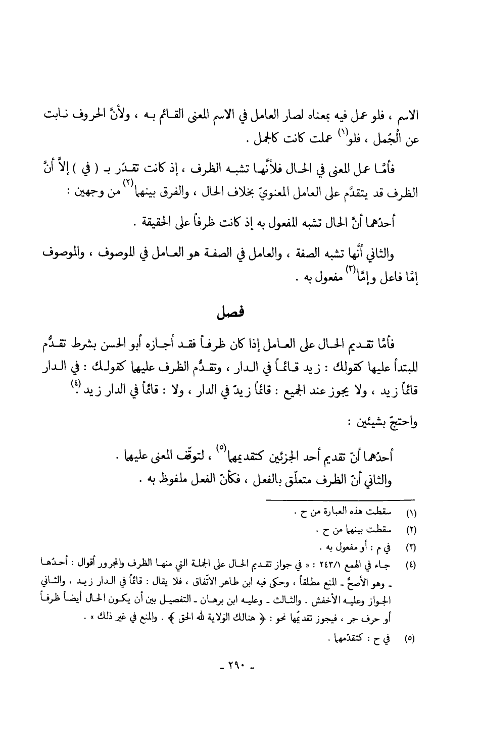 فأمَّا عمل الْمَعْنى فِي الْحَال فلأنَّها تشبه الظّرْف إِذْ كَانَت تقدّر ب (فِي) إلاَّ أنَّ الظّرْف قد يتَقَدَّم على الْعَامِل المعنويّ بِخِلَاف الْحَال وَالْفرق بَينهمَا من وَجْهَيْن أحدُهما أنَّ الْحَال تشبه الْمَفْعُول بِهِ إِذْ كَانَت ظرفا على الْحَقِيقَة وَالثَّانِي أنَّها تشبه الصّفة وَالْعَامِل فِي الصّفة هُوَ الْعَامِل فِي الْمَوْصُوف والموصوف إمَّا فَاعل وإمَّا مفعول بِهِ