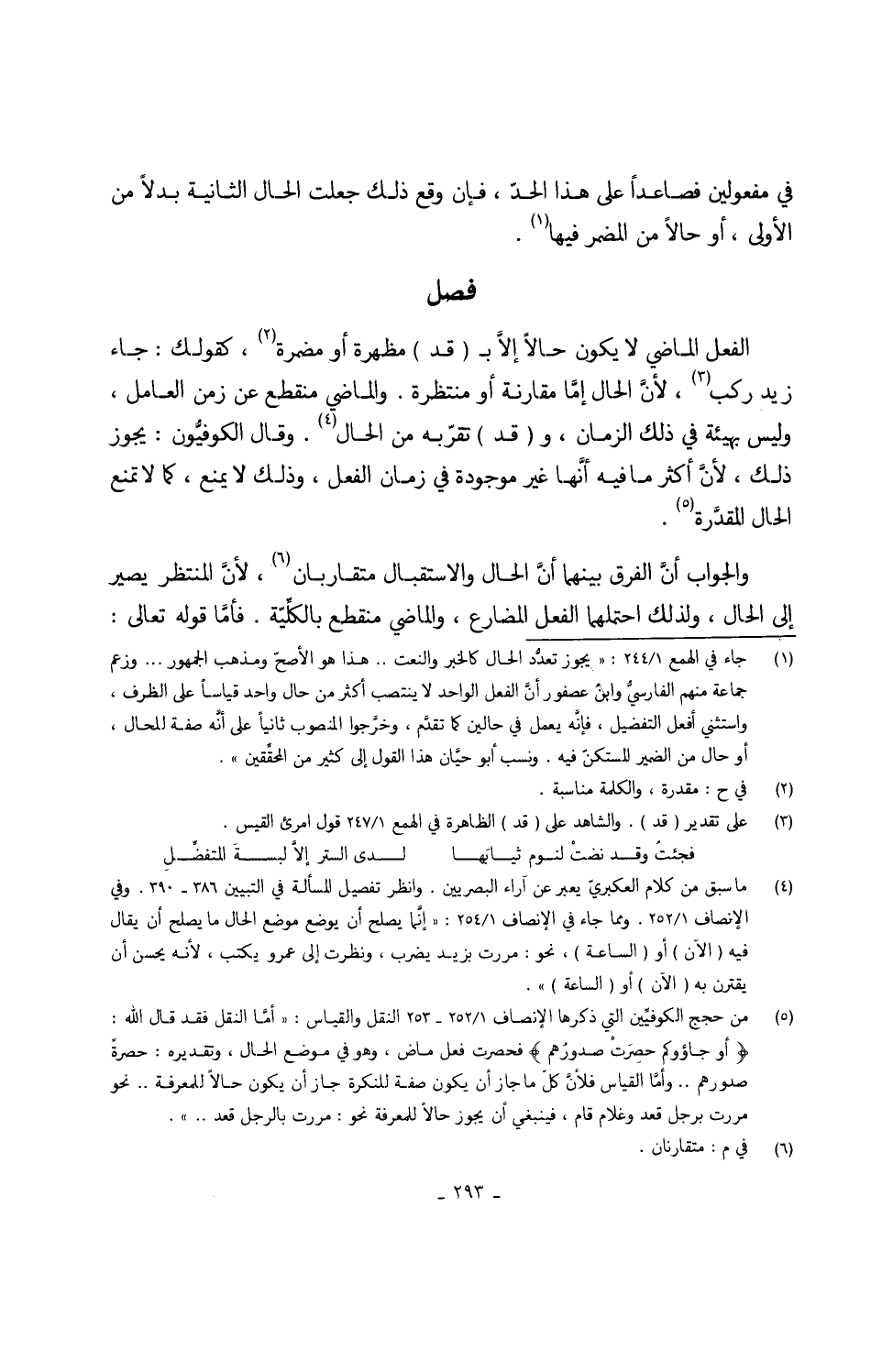 الْفِعْل الْمَاضِي لايكون حَالا إلاَّ ب (قد) مظهرة أَو مضمرة كَقَوْلِك جَاءَ زيد ركب لأنَّ الْحَال إمَّا مُقَارنَة أَو منتظرة والماضي مُنْقَطع عَن زمن الْعَامِل وَلَيْسَ بهيئة فِي ذَلِك الزَّمَان و (قد) تقربه من الْحَال وَقَالَ الكوفيُّون يجوز ذَلِك لأنَّ أَكثر مَا فِيهِ أنَّها غير مَوْجُودَة فِي زمَان الْفِعْل وَذَلِكَ لَا يمْنَع لَا تمنع الْحَال المقدَّرة