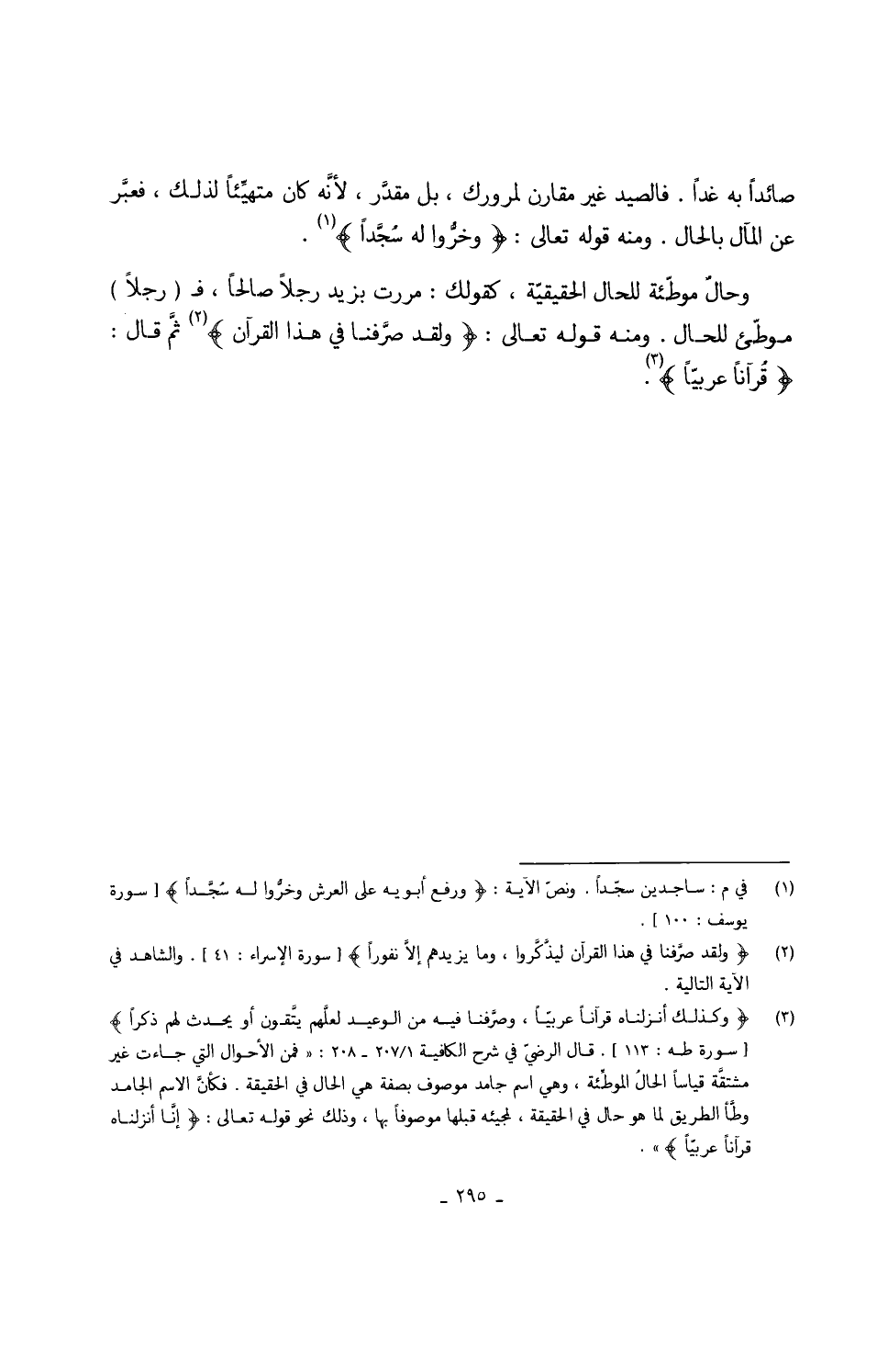صائداً بِهِ غَدا فالصيد غير مُقَارن لمرورك بل مقدَّر لأنَّه كَانَ متهيئا لذَلِك فَعبر عَن المَال بِالْحَال وَمِنْه قَوْله تَعَالَى {وخرُّوا لَهُ سُجَّداً} وحالٌ موطّئة للْحَال الْحَقِيقِيَّة كَقَوْلِك مَرَرْت بزيد رجلا صَالحا ف (رجلا) موّطئ للْحَال وَمِنْه قَوْله تَعَالَى {وَلَقَد صرَّفنا فِي هَذَا الْقُرْآن} ثَّم قَالَ {قُرآناً عربيّاً}