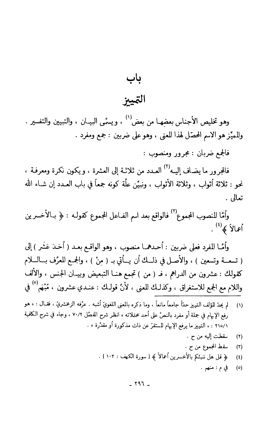 وَهُوَ تَخْلِيص الْأَجْنَاس بَعْضهَا من بعض وَيُسمى الْبَيَان والتبيين وَالتَّفْسِير والممَّيز هُوَ الِاسْم المحصل لهَذَا الْمَعْنى وَهُوَ على ضَرْبَيْنِ جمع ومفرد فالجمع ضَرْبَان مجرور ومنصوب فالمجرور مَا يُضَاف إِلَيْهِ الْعدَد من ثَلَاثَة إِلَى الْعشْرَة وَيكون نكرَة وَمَعْرِفَة نَحْو ثَلَاثَة أَثوَاب وَثَلَاثَة الاثواب ونبين علَّة كَونه جمعا فِي بَاب الْعدَد إِن شَاءَ الله تَعَالَى