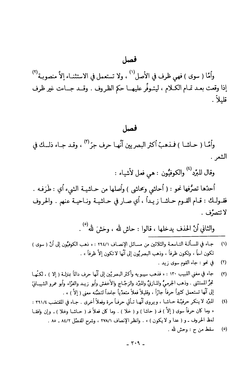وَقَالَ المبِّرد والكوفيَّون هِيَ فعل لِأَشْيَاء أَحدهَا تصرَّفها نَحْو (أحاشي ومحاشى) وَأَصلهَا من حَاشِيَة الشَّيْء أَي طرفه فقولك قَامَ الْقَوْم حاشا زيدا أَي صَار فِي حَاشِيَة وناحية عَنْهُم والحروف لَا تتّصرف وَالثَّانِي أنَّ الْحَذف يدخلهَا قَالُوا حاش لله وَحش لله