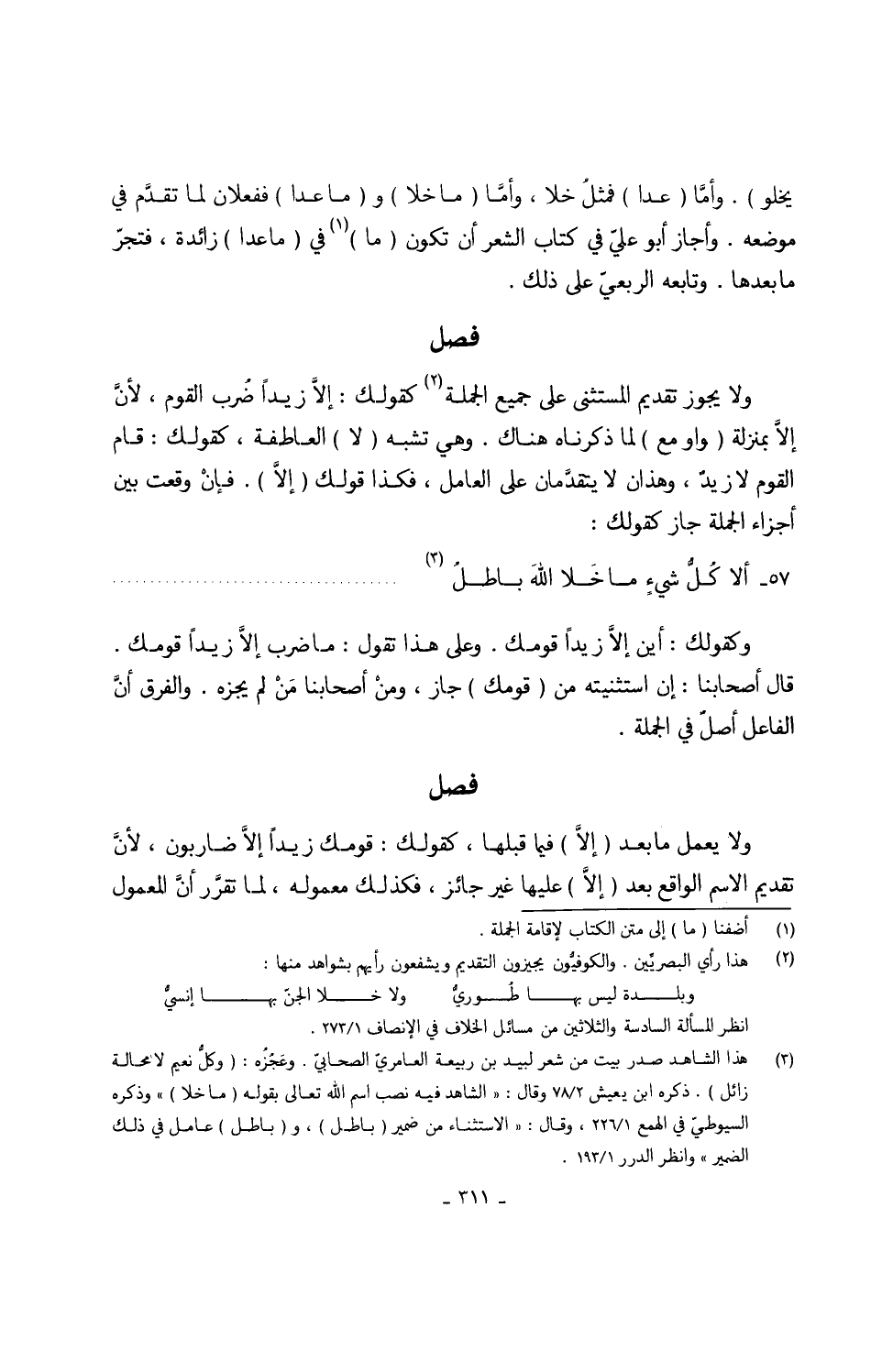 وَلَا يجوز تَقْدِيم الْمُسْتَثْنى على جَمِيع الْجُمْلَة كَقَوْلِك إلاَّ زيدا ضُرب الْقَوْم لأنَّ إلاَّ بِمَنْزِلَة (وَاو مَعَ) لما ذَكرْنَاهُ هُنَاكَ وَهِي تشبه (لَا) العاطفة كَقَوْلِك قَامَ الْقَوْم لَا زيدٌ وَهَذَانِ لايتقدَّمان على الْعَامِل فَكَذَا قَوْلك (إلاَّ) فإنْ وَقعت بَين أَجزَاء الْجُمْلَة جَازَ كَقَوْلِك 57 -