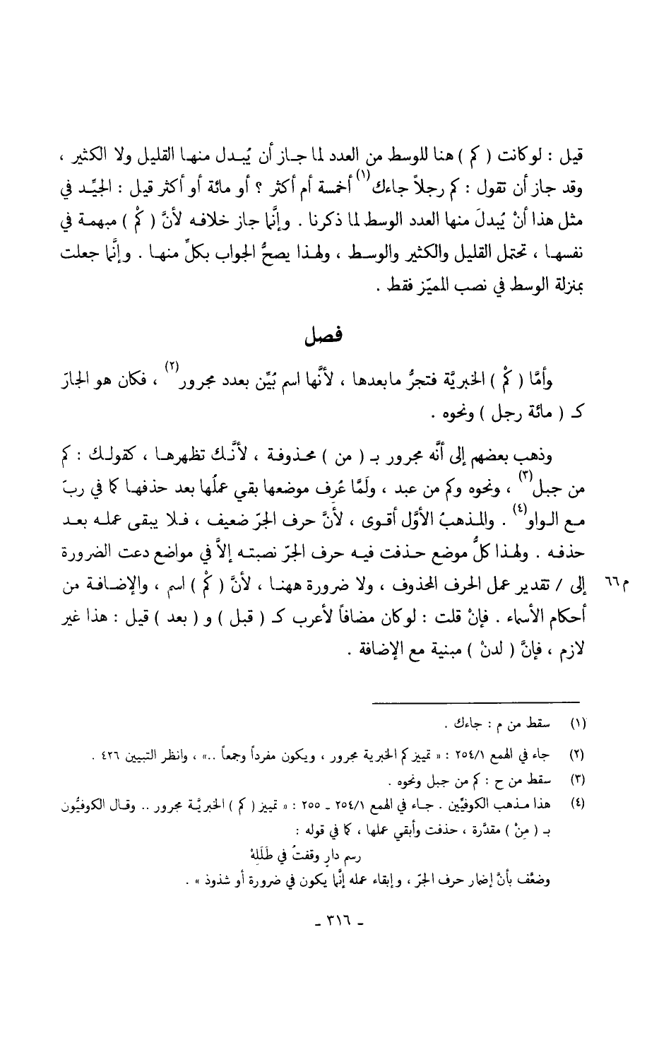 وَذهب بَعضهم إِلَى أنَّه مجرور ب (من) محذوفة لأنَّك تظهرها كَقَوْلِك كم من جبل وَنَحْوه وَكم من عبد ولَمَّا عُرف موضعهَا بَقِي عملُها بعد حذفهَا كَمَا فِي ربّ مَعَ الْوَاو والمذهبُ الأوَّل أقوى لأنَّ حرف الجرّ ضَعِيف فَلَا يبْقى عمله بعد حذفه وَلِهَذَا كُّل مَوضِع حذفت فِيهِ حرف الجرّ نصبته إلاَّ فِي مَوَاضِع دعت الضَّرُورَة إِلَى تَقْدِير عمل الْحَرْف الْمَحْذُوف وَلَا ضَرُورَة هَهُنَا لأنَّ (كْم) اسْم وَالْإِضَافَة من أَحْكَام الْأَسْمَاء فإنْ قلت لَو كَانَ مُضَافا لأعرب ك (قبل) و (بعد) قيل هَذَا غير لَازم فإنَّ (لدنْ) مَبْنِيَّة مَعَ الْإِضَافَة