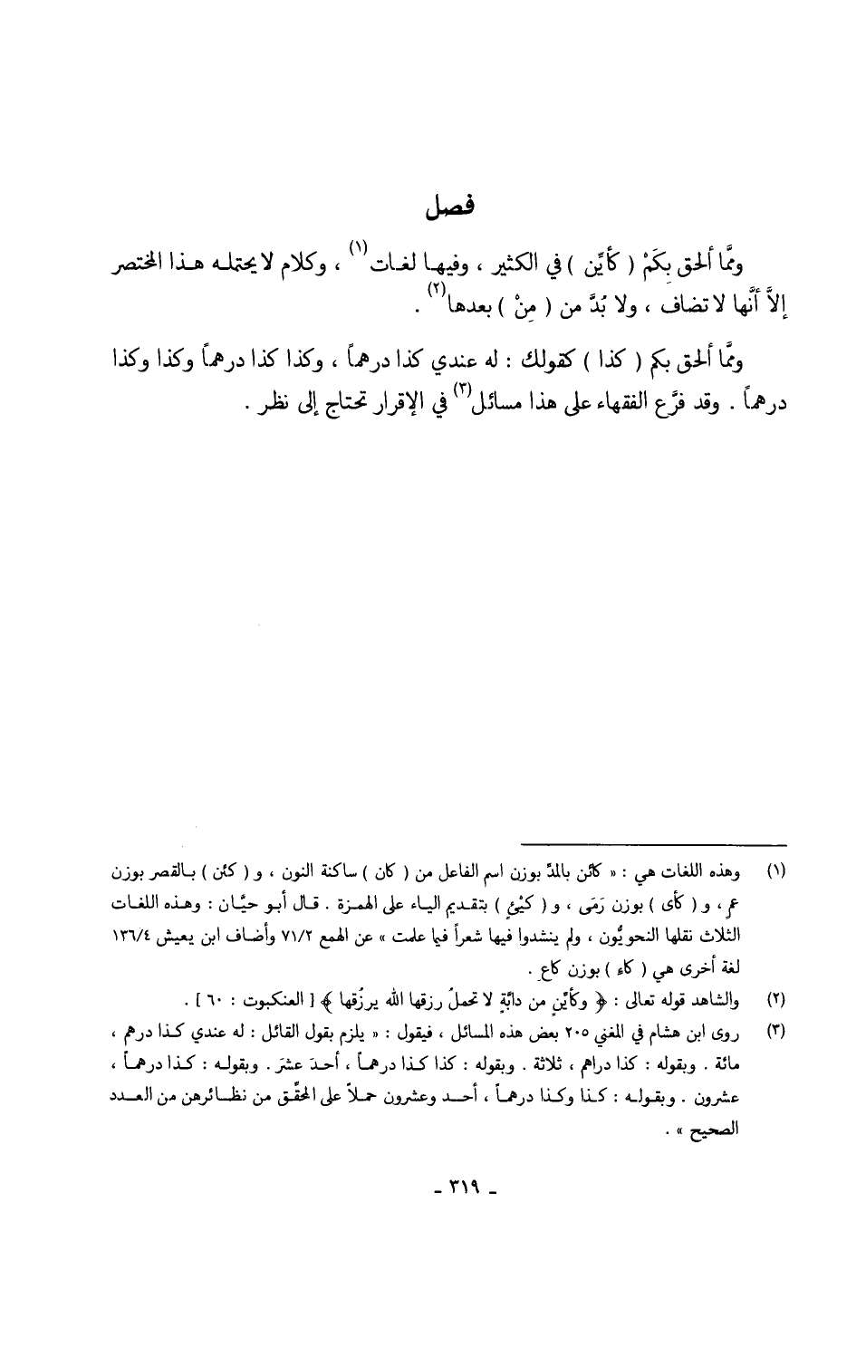 وممَّا أْلحق بكم (كَذَا) كَقَوْلِك لَهُ عِنْدِي كَذَا درهما وَكَذَا كَذَا درهما وَكَذَا وَكَذَا درهما وَقد فرَّع الْفُقَهَاء على هَذَا مسَائِل فِي الْإِقْرَار تحْتَاج إِلَى نظر