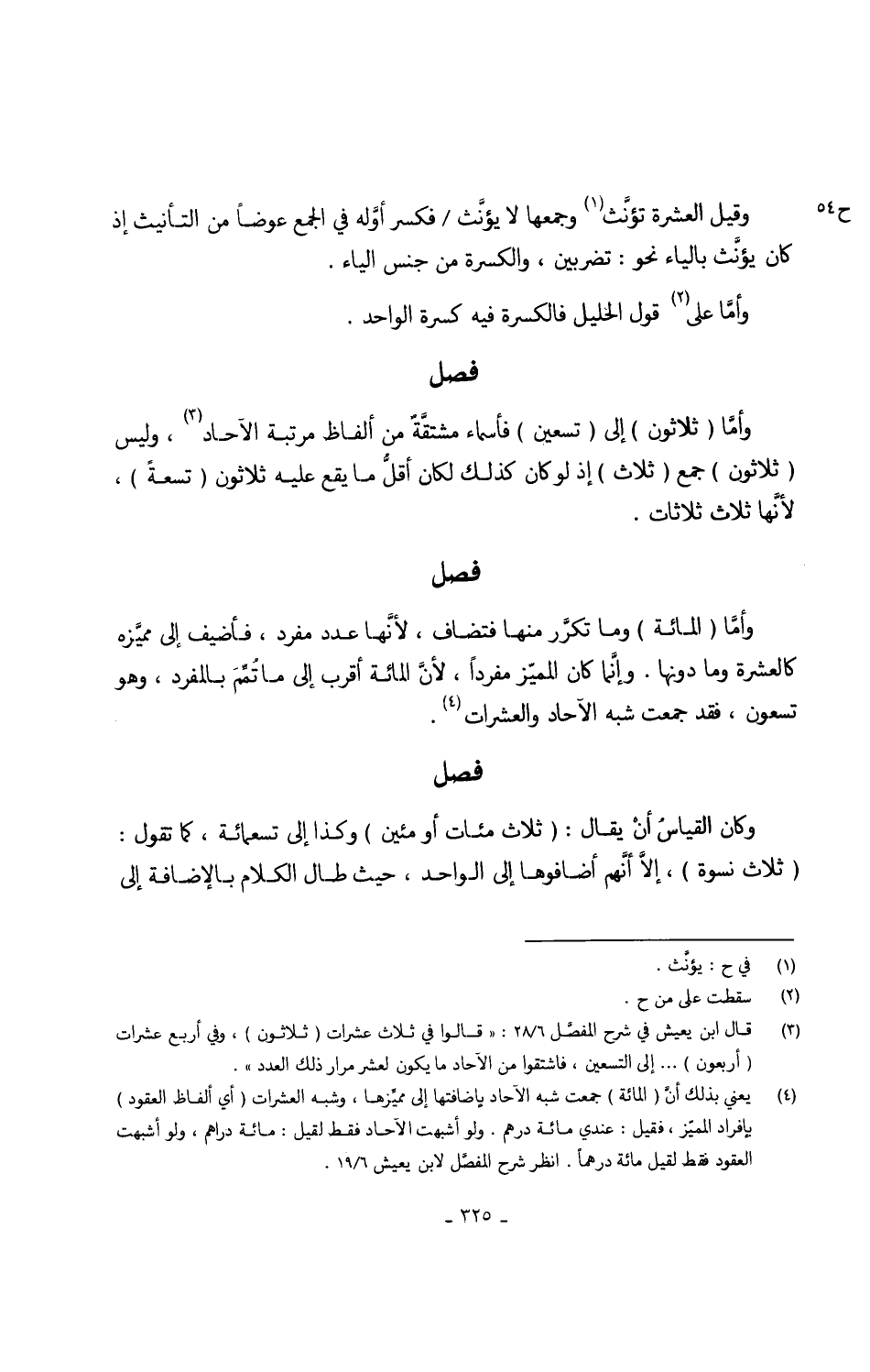 وأمَّا (ثَلَاثُونَ) إِلَى (تسعين) فأسماء مشتقَّةٌ من أَلْفَاظ مرتبَة الْآحَاد وَلَيْسَ (ثَلَاثُونَ) جمع (ثَلَاث) إِذْ لَو كَانَ كَذَلِك لَكَانَ أقلُّ مَا يَقع عَلَيْهِ ثَلَاثُونَ (تِسْعَة) لأنَّها ثَلَاث ثلاثات