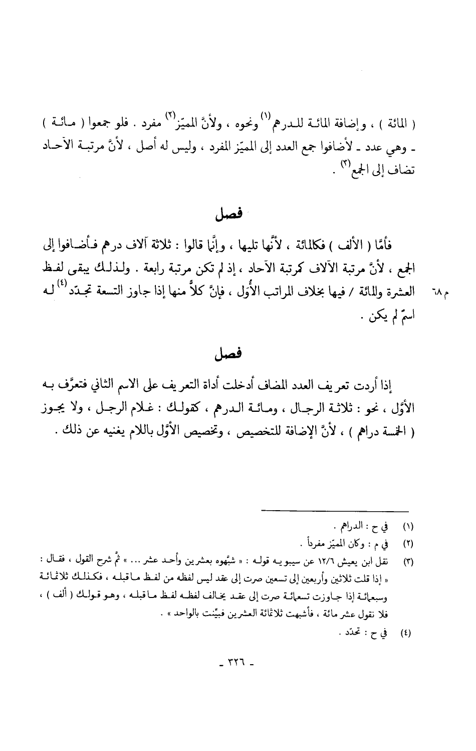 (الْمِائَة) وَإِضَافَة الْمِائَة للدرهم وَنَحْوه ولأنَّ المميّز مُفْرد فَلَو جمعُوا (مائَة) وَهِي عدد - لأضافوا جمع الْعدَد إِلَى المميّز الْمُفْرد وَلَيْسَ لَهُ أصل لأنَّ مرتبَة الْآحَاد تُضَاف إِلَى الْجمع
