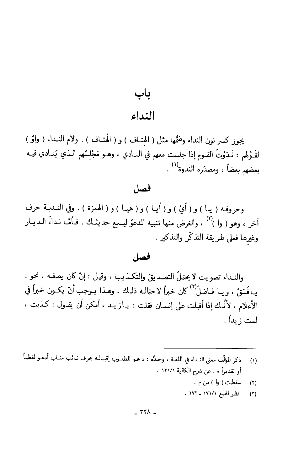 وحروفه (يَاء) و (أيْ) و (أيا) و (هيا) و (الْهمزَة) وَفِي الندبة حرف آخر وَهُوَ (وَا) وَالْغَرَض مِنْهَا تَنْبِيه المدعوّ ليسمع حَدِيثك فأمَّا نِدَاء الديار وَغَيرهَا فعلى طَريقَة التذكّر والتذكير