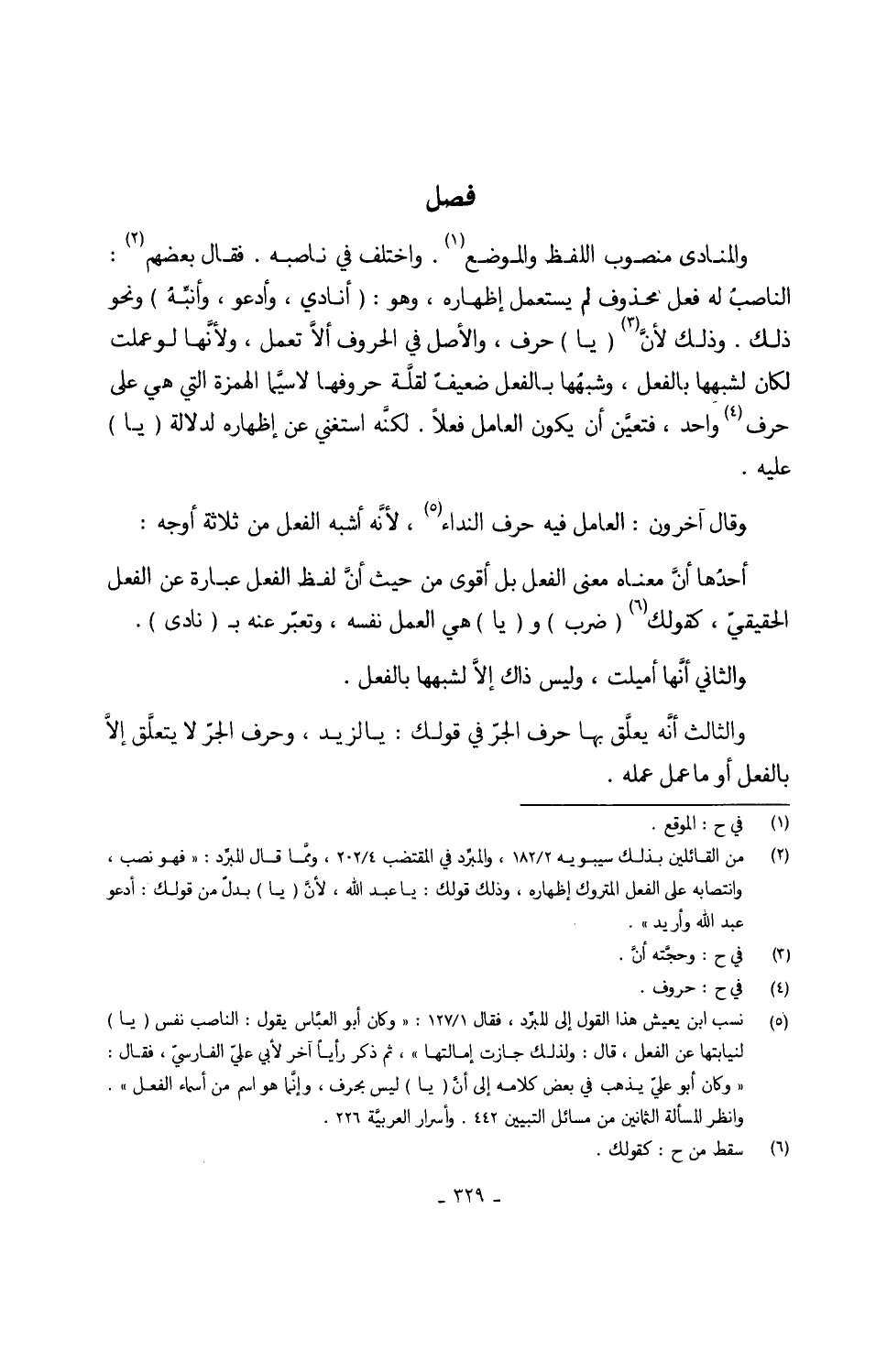 والمنادى مَنْصُوب اللَّفْظ والموضع وَاخْتلف فِي ناصبه فَقَالَ بَعضهم الناصبُ لَهُ فعل مَحْذُوف لم يسْتَعْمل إضهاره وَهُوَ (أنادي وأدعو وأنَّبهُ) وَنَحْو ذَلِك وَذَلِكَ لأنَّ (يَا) حرف وَالْأَصْل فِي الْحُرُوف ألاَّ تعْمل ولأنَّها لَو عملت لَكَانَ لشبهها بِالْفِعْلِ وشبهُها بِالْفِعْلِ ضعيفٌ لقلّة حروفها لَا سيَّما الْهمزَة الَّتِي هِيَ على حرف وَاحِد فتعيَّن أَن يكون الْعَامِل فعلا لكنَّه استغني عَن إِظْهَاره لدلَالَة (يَا) عَلَيْهِ