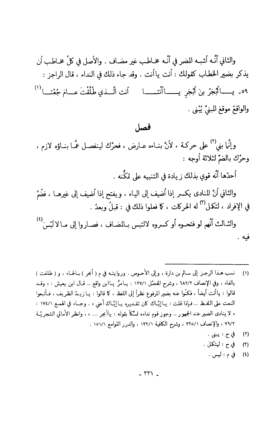 أحدُها أنَّه قوي بذلك زِيَادَة فِي التَّنْبِيه على تمكَّنه وَالثَّانِي أنَّ المنادى يكسر إِذا أضيف إِلَى الْيَاء وَيفتح إِذا أضيف إِلَى غَيرهَا فضُمَّ فِي الْإِفْرَاد لتكمل لَهُ الحركات كَمَا فعلوا ذَلِك فِي قبلُ وبعدُ وَالثَّالِث أنَّهم لَو فتحوه أَو كسروه لالتبس بالمضاف فصاروا إِلَى مَا لَا لَبْس فِيهِ