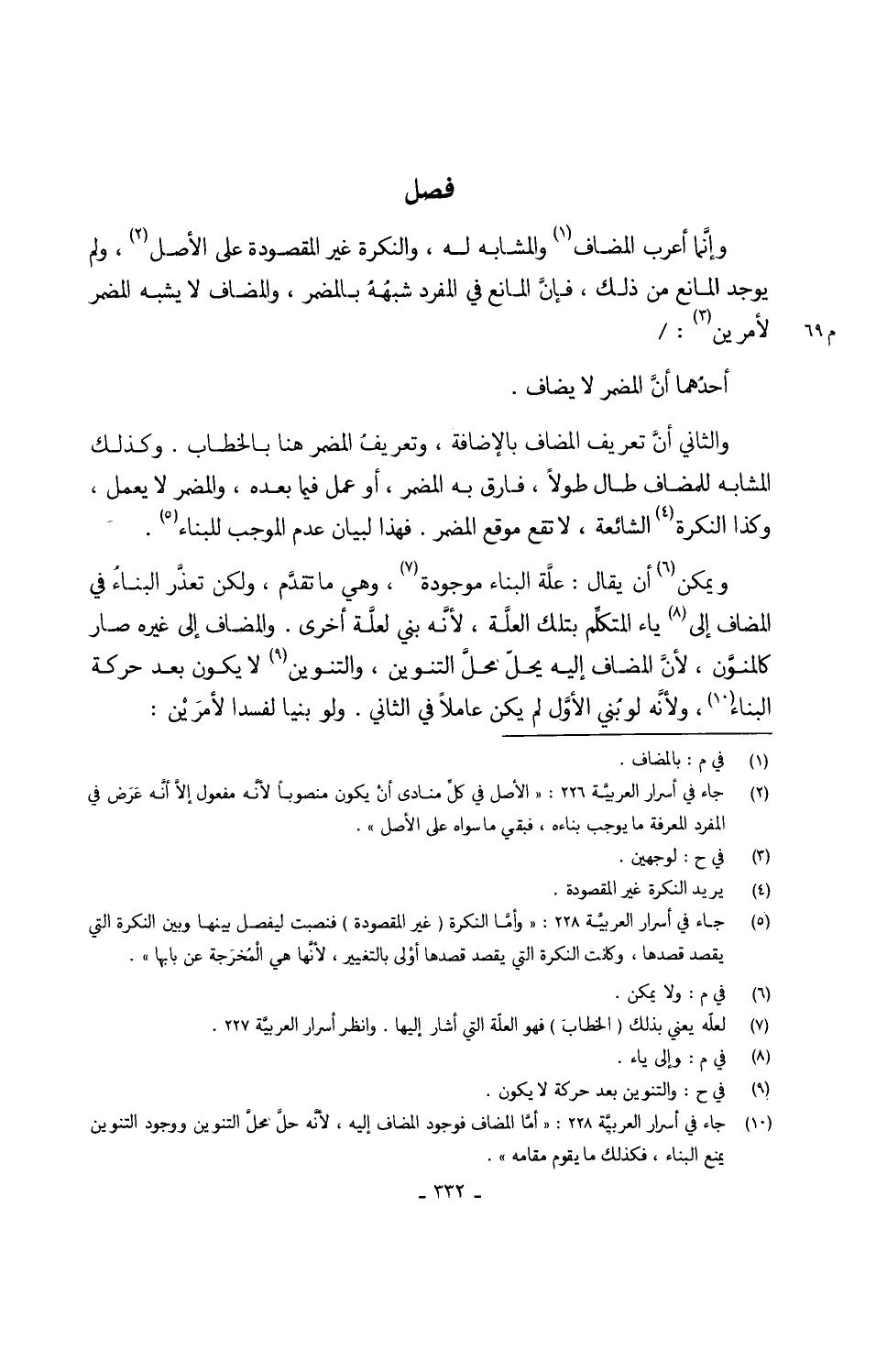 وَالثَّانِي أنَّ تَعْرِيف الْمُضَاف بِالْإِضَافَة وتعريفُ الْمُضمر هُنَا بِالْخِطَابِ وَكَذَلِكَ المشابه للمضاف طَال طولا فَارق بِهِ الْمُضمر أَو عمل فِيمَا بعده والمضمر لَا يعْمل وَكَذَا النكرَة الشائعة لَا تقع موقع الْمُضمر فَهَذَا لبَيَان عدم الْمُوجب للْبِنَاء
