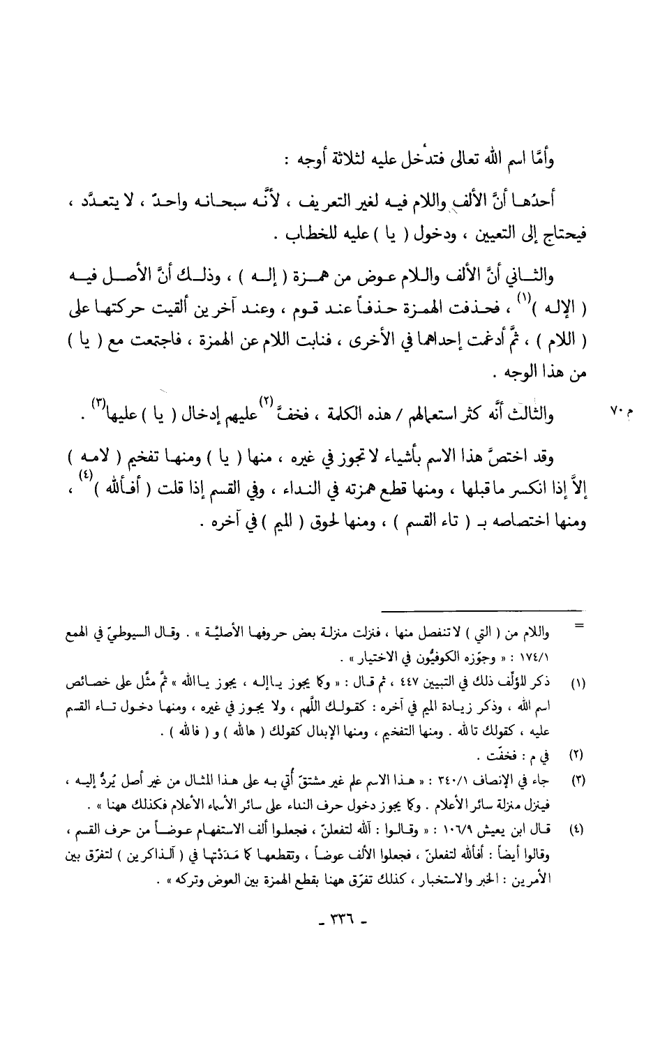 وأمَّا اسْم الله تَعَالَى فَتدخل عَلَيْهِ لثَلَاثَة أوجه أحدُها أنَّ الْألف وَاللَّام فِيهِ لغير التَّعْرِيف لأنّه سُبْحَانَهُ واحدٌ لَا يتعدَّد فَيحْتَاج إِلَى التَّعْيِين وَدخُول (يَا) عَلَيْهِ للخطاب وَالثَّانِي أَن الْألف وَاللَّام عوض من همزَة (إِلَه) وَذَلِكَ أنَّ الأَصْل فِيهِ (الْإِلَه) فحذفت الْهمزَة حذفا عِنْد قوم وَعند آخَرين القيت حركتها على (اللَّام) ثَّم أدغمت إِحْدَاهمَا فِي الْأُخْرَى فنابت اللَّام عَن الْهمزَة فأجتمعت مَعَ (يَا) من هَذَا الْوَجْه وَالثَّالِث أنَّه كثر أستعمالهم هَذِه الْكَلِمَة فخفَّ عَلَيْهِم إِدْخَال (يَا) عَلَيْهَا