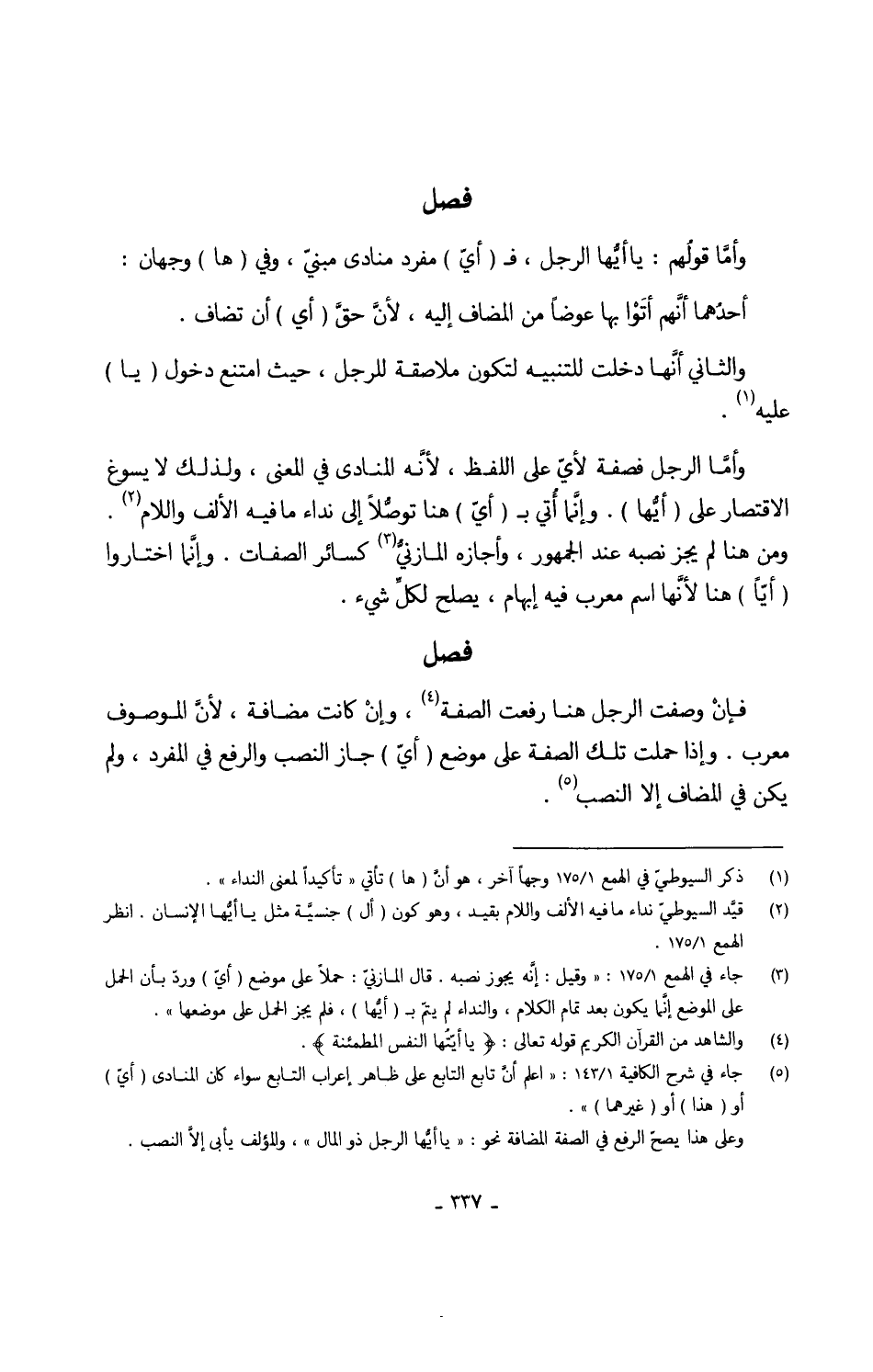 وأمَّا قولُهم يَا أيَّها الرجل ف (أيّ) مُفْرد منادى مبنيّ وَفِي (هَا) وَجْهَان أحدُهما أنّهم أتَوْا بهَا عوضا من الْمُضَاف إِلَيْهِ لأنَّ حقّ (أَي) أَن تُضَاف وَالثَّانِي أَنَّهَا دخلت للتّنْبِيه لتَكون ملاصقة للرجل حَيْثُ امْتنَاع دُخُول (يَا) عَلَيْهِ