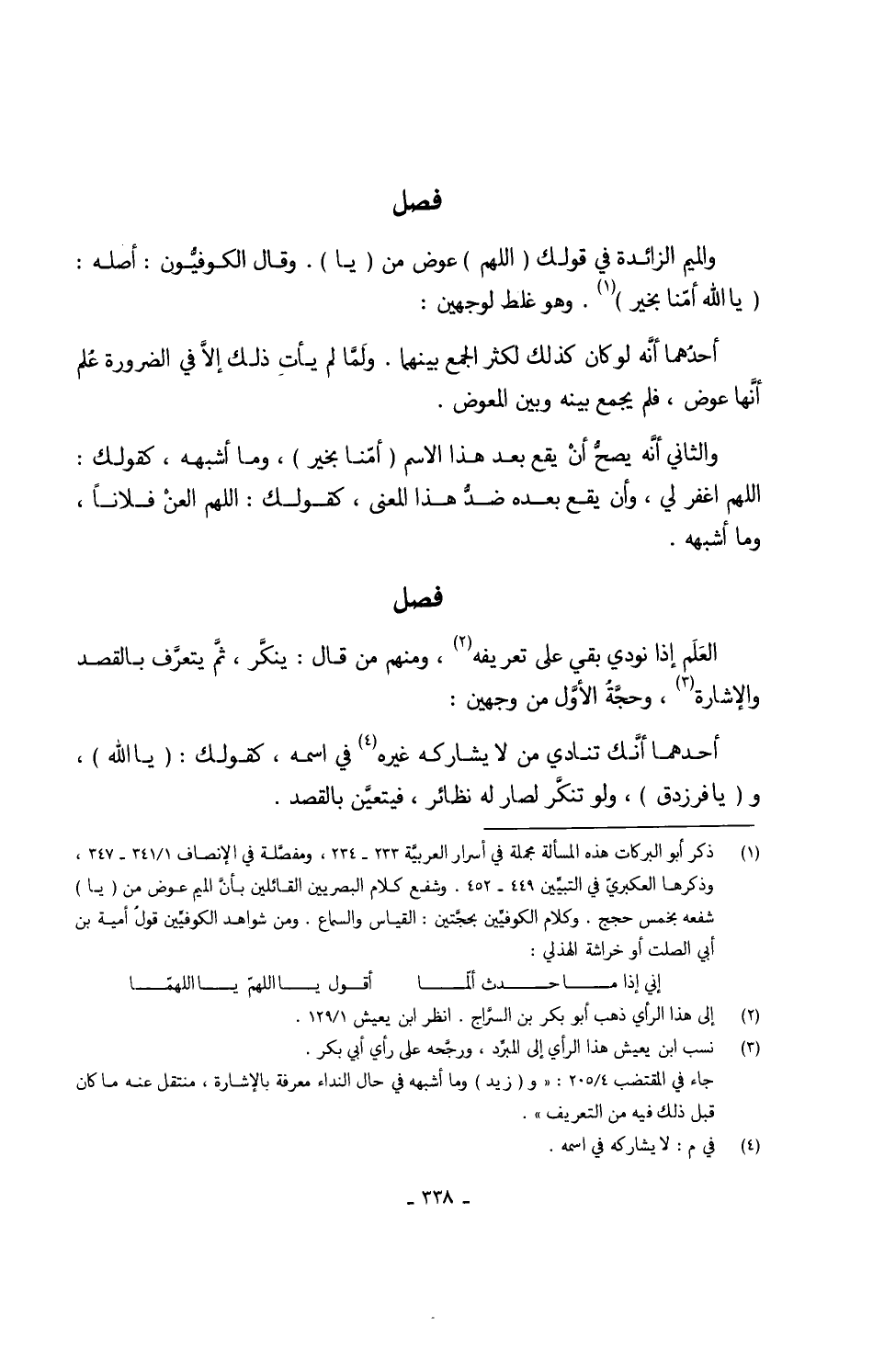 وَالْمِيم الزَّائِدَة فِي قَوْلك (اللَّهُمَّ) عوض من (يَا) وَقَالَ الكوفيَّون أَصله (يَا الله أمّنا بِخَير) وَهُوَ غلط لوَجْهَيْنِ أحدُهما أنَّه لَو كَانَ كَذَلِك لكثر الْجمع بَينهمَا ولّمَّا لم يأتِ ذَلِك إلاَّ فِي الضَّرُورَة عُلم أنَّه عوض فَلم يجمع بَينه وَبَين المعوض وَالثَّانِي أنَّه يصحُّ أنْ يَقع بعد هَذَا الِاسْم (أمّنا بِخَير) وَمَا أشبهه كَقَوْلِك اللَّهُمَّ أَغفر لي وَأَن يَقع بعده ضدُّ هَذَا الْمَعْنى كَقَوْلِك اللَّهُمَّ العنْ فلَانا وَمَا أشبهه