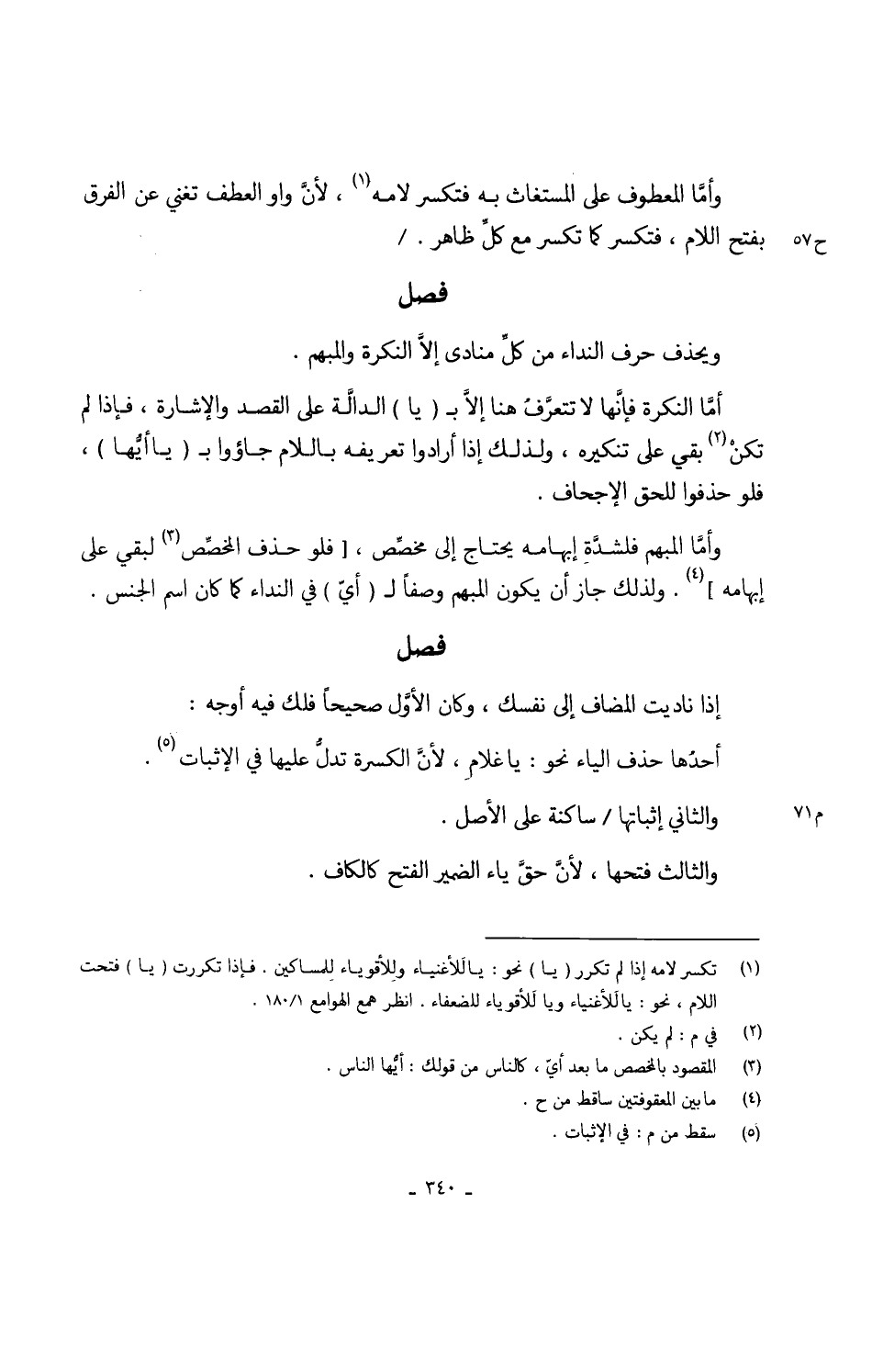 ويحذف حرف النداء من كلّ منادى إلاَّ النكرَة والمبهم أمَّا النكرَة فإنَّها لَا تتعرَّفُ هُنَا إلاَّ ب (يَا) الدالَّة على الْقَصْد وَالْإِشَارَة فَإِذا لم تكنْ بَقِي على تنكيره وَلذَلِك إِذا ارادوا تَعْرِيفه بِاللَّامِ جاؤوا ب (يَا أيُّها) فَلَو حذفوا للحق الإجحاف