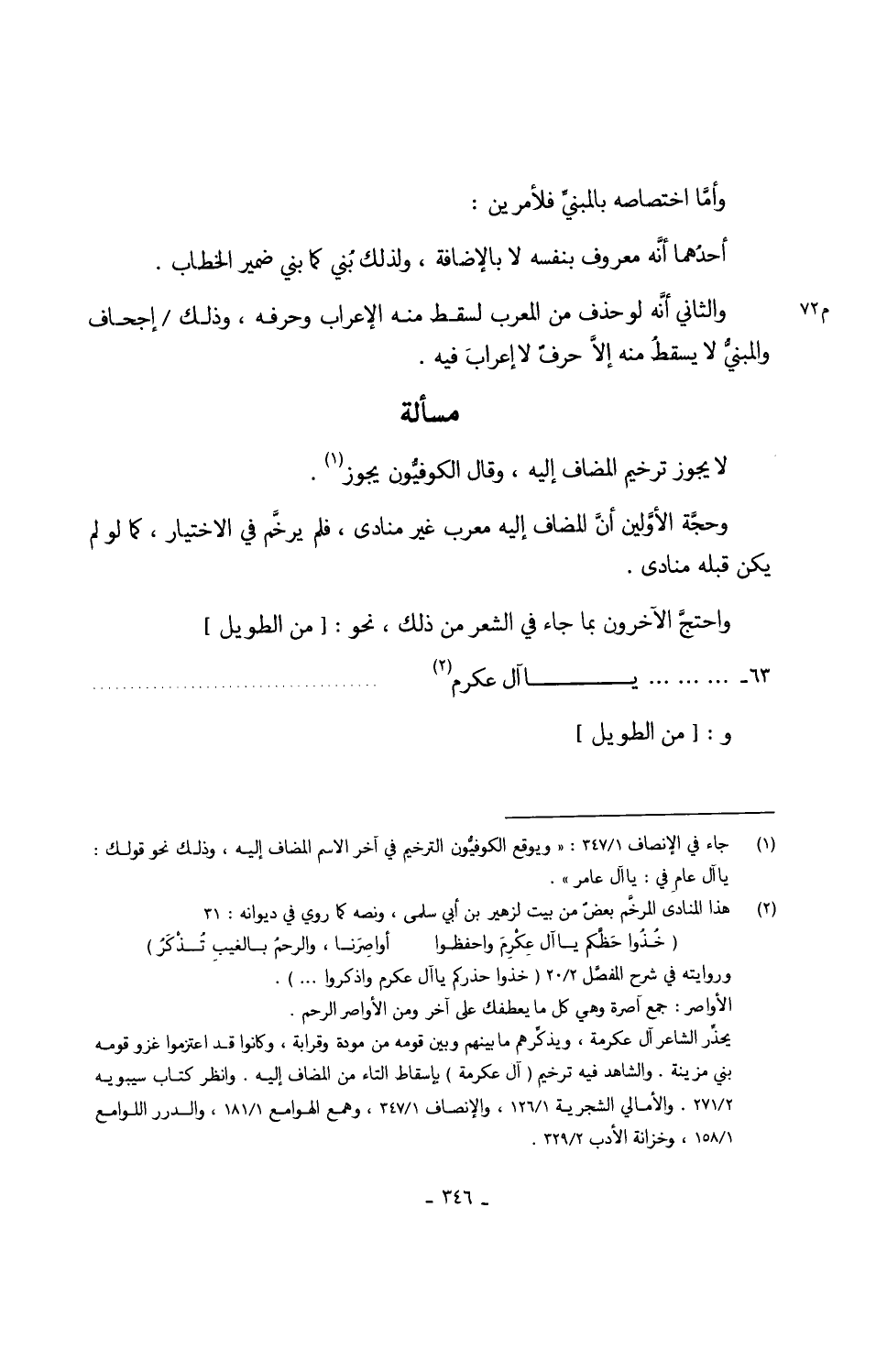 لَا يجوز ترخيم الْمُضَاف إِلَيْهِ وَقَالَ الكوفُّيون يجوز وحجَّة الأوَّلين أنَّ الْمُضَاف لإليع مُعرب غير منادى فَلم يرخمَّ فِي الِاخْتِيَار كَمَا لولم يكن قبله منادى