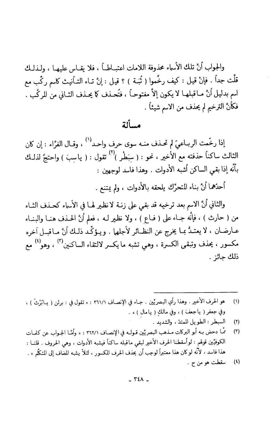 إِذا رخّمت الرباعيّ لم تحذف مِنْهُ سوى حرف وَاحِد وَقَالَ الفرَّاء إِن كَانَ الثَّالِث سَاكِنا حذفته مَعَ الْأَخير نَحْو (سِبَطْر) تَقول (يَا سِبَ) واحتجَّ لذَلِك بأنَّه إِذا بَقِي السَّاكِن اشبه الأدوات وَهَذَا فَاسد لوَجْهَيْنِ أحدُهما أنَّ بِنَاء المتحرَّك يلْحقهُ بالأدوات وَلم يمْتَنع وَالثَّانِي أنَّ الِاسْم بعد ترخيمه قد بَقِي على زنة لَا نَظِير لَهَا فِي الْأَسْمَاء كحذف الثَّاء من (حَارِث) فإنَّه جَاءَ على (فاعِ) وَلَا نَظِير لَهُ فَعلم أنَّ الْحَذف هُنَا وَالْبناء عارضان لَا يعتدُّ بِمَا يخرج عَن النَّظَائِر لأجلهما ويؤكَّد ذَلِك أنَّ ماقبل آخِره مكسور يحذف وَتبقى الكسرة وَهِي تشبه مَا يكسر لالتقاء الساكنين وَهُوَ مَعَ ذَلِك جَائِز