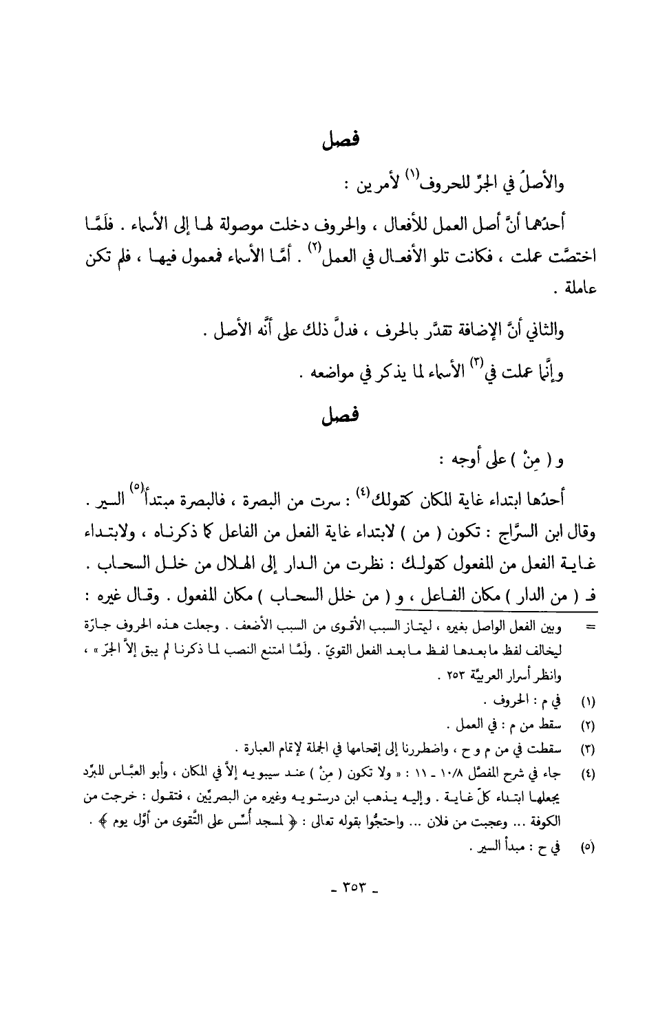 وَالْأَصْل فِي الجرّ للحروف لأمرين أحدُهما أَن أصل الْعَمَل للأفعال والحروف دخلت مَوْصُولَة لَهَا إِلَى الْأَسْمَاء فلَمَّا اختصَّت عملت فَكَانَت تلو الْأَفْعَال فِي الْعَمَل أما الْأَسْمَاء فمعمول فِيهَا فَلم تكن عاملة وَالثَّانِي أَن الإضافه تقدَّر بالحرف فدلَّ ذَلِك على أنَّه الأَصْل وإنمَّا عملت فِي الْأَسْمَاء لما يذكر فِي موَاضعه