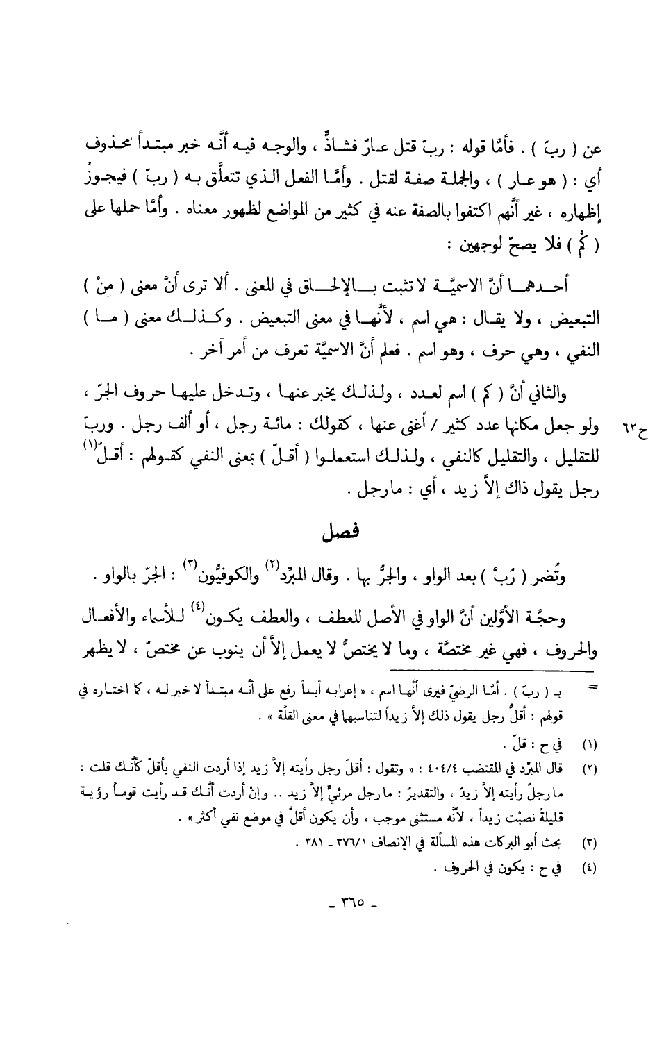 عَن (ربّ) فأمّا قَوْله ربّ قتل عارٌ فشاذّ وَالْوَجْه فِيهِ أنَّه خبر مُبْتَدأ مَحْذُوف أَي (هُوَ عَار) وَالْجُمْلَة صفة لقتل وأمّا الْفِعْل الَّذِي تتعلَّق بِهِ (ربّ) فَيجوز إضهاره غير أنَّهم اكتفوا بِالصّفةِ عَنهُ فِي كثير من الْمَوَاضِع لظُهُور مَعْنَاهُ وأمَّا حملهَا على (كْم) فَلَا يصحّ لوَجْهَيْنِ أَحدهمَا أنَ الأسميَّة لَا تثبت فِي معنى بالإلحاق فِي الْمَعْنى أَلا ترى أنَّ معنى (مِنْ) التبغيض وَلَا يُقَال هِيَ اسْم لأنَّها التَّبْعِيض وَكَذَلِكَ معنى (مَا) النَّفْي وَهِي حرف وَهُوَ اسْم فَعلم أنَّ الأسمَّية تعرف من أَمر آخر وَالثَّانِي أنَّ (كم) اسْم لعدد وَلذَلِك يخبر عَنْهَا وَتدْخل عَلَيْهَا حُرُوف الجرّ وَلَو جعل مَكَانهَا عهدد كثير أغْنى عنهاكقولك مائَة رجل أَو ألف رجل وربّ للتقليل والتقليل كالنفي وَلذَلِك استعملوا (أقلّ) بِمَعْنى النَّفْي كَقَوْلِهِم أقلّ رجل يَقُول ذَاك إلاَّ زيد أَي مَا رجل