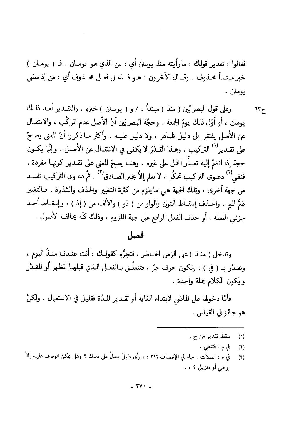 وعَلى قَول البصريَّين (مُنْذُ) مُبْتَدأ و (يَوْمَانِ) خَبره وَالتَّقْدِير أمد ذَلِك يَوْمَانِ أَو أوَّل ذَلِك يومُ الْجُمُعَة وحجَّة البصريَّين أنَّ الأَصْل عدم المركَّب والانتقال عَن الأَصْل يفْتَقر إِلَى دَلِيل ظَاهر وَلَا دَلِيل عَلَيْهِ وَأكْثر مَا ذكرُوا أنَّ الْمَعْنى يَصح على تَقْدِير التَّرْكِيب وَهَذَا القَدْرُ لَا يَكْفِي فِي الِانْتِقَال عَن الأَصْل وإنَّما يكون حجَّة إِذا انضمَّ إِلَيْهِ تعذُّر الْحمل على غَيره وَهنا يصحّ الْمَعْنى على تَقْدِير كَونهَا مُفْردَة فنفي دَعْوَى التَّرْكِيب تحكُّم لَا يعلم إلاَّ بالْخبر الصَّادِق ثَّم دَعْوَى التَّرْكِيب تفْسد من جِهَة أُخْرَى وَتلك الْجِهَة هِيَ مَا يلْزم من كَثْرَة التَّغْيِير والحذف والشذوذ فالتغيير ضمُّ الْمِيم والحذف إِسْقَاط النُّون وَالْوَاو من (ذُو) وَالْألف من إِذْ وَإِسْقَاط أحد جزئي الصِّلَة أَو حذف الْفِعْل الرافع على جِهَة اللُّزُوم وَذَلِكَ كلّه يُخَالف الْأُصُول