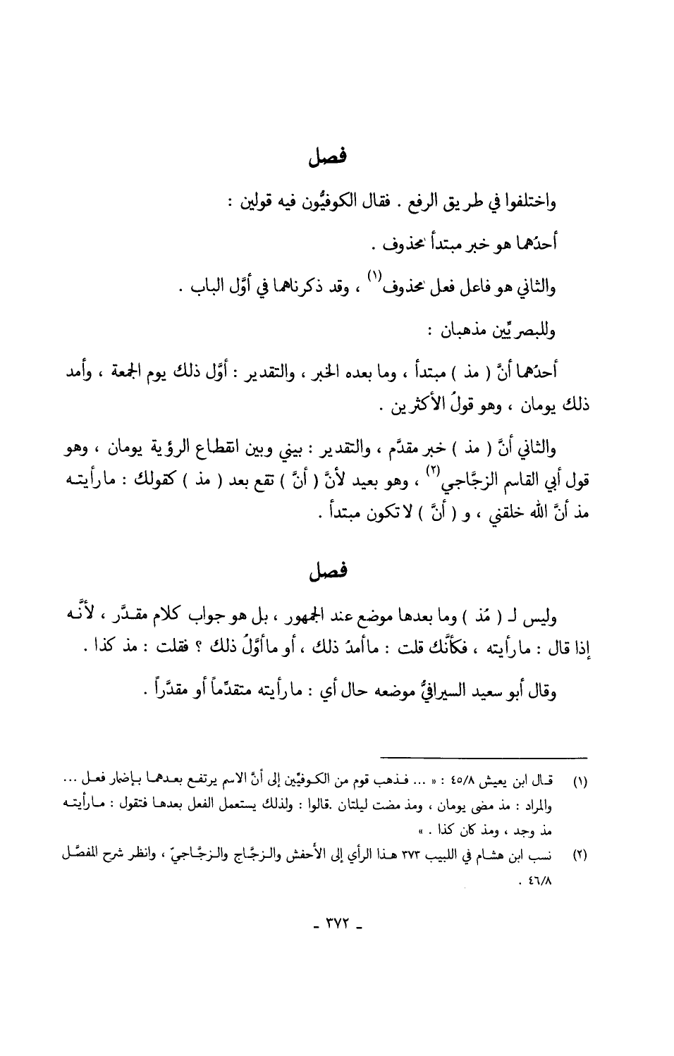 وللبصريَّين مذهبان أحدُهما أنَّ (مذ) مُبْتَدأ وَمَا بعده الْخَبَر وَالتَّقْدِير أوَّل ذَلِك يَوْم الْجُمُعَة وأمد ذَلِك يَوْمَانِ وَهُوَ قولُ الْأَكْثَرين وَالثَّانِي أنَّ (مذ) خبر مقدَّم وَالتَّقْدِير بيني وَبَين انْقِطَاع الرُّؤْيَة يَوْمَانِ وَهُوَ قَول أبي الْقَاسِم الزجَّاجي وَهُوَ بعيد لأنَّ (أنَّ) تقع بعد (مذ) كَقَوْلِك مَا رَأَيْته مذ أنَّ الله خلقني و (أنَّ) لَا تكون مُبْتَدأ