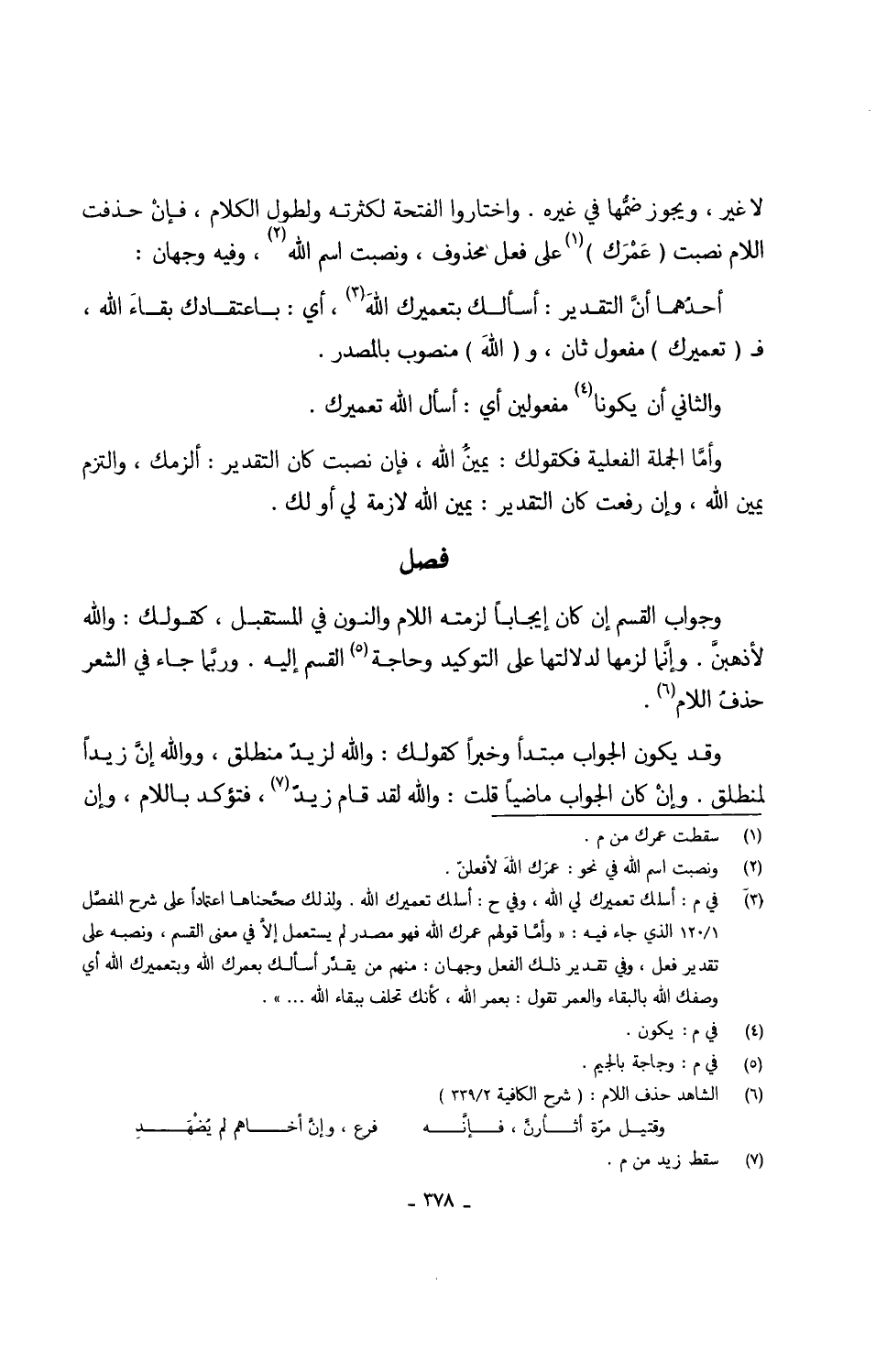 لَا غير وَيجوز ضمُّها فِي غَيره واختاروا الفتحة لكثرته ولطول الْكَلَام فإنْ حذفت اللَّام نصبت (عَمْرَك) على فعل مَحْذُوف ونصبت إسم الله وَفِيه وَجْهَان أحدُهما أنَّ التَّقْدِير أَسأَلك بتعميرك اللهَ أَي باعتقادك بقاءَ الله ف (تعميرك) مفعول ثَان و (الله) مَنْصُوب بِالْمَصْدَرِ وَالثَّانِي أَن يَكُونَا مفعولين أَي أسأَل الله تعميرك