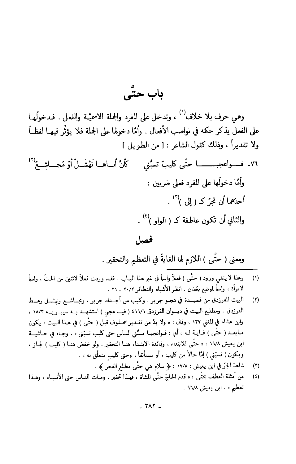 (فواعجبا حتَّى كليبٌ تسبّني ... كَأَن أَبَاهَا نَهْشلُ أوْ مُجاشعُ) // الطَّوِيل // وأمَّا دخولُها على الْمُفْرد فعلى ضَرْبَيْنِ أحدُهما أنَّ تجر ك (إِلَى) وَالثَّانِي أَن تكون عاطفة ك (الْوَاو)