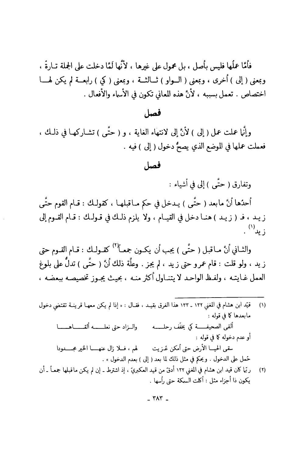 وتفارق (حتَّى) إِلَى فِي أَشْيَاء أحدُها أنَّ مَا بعد حتَّى يدْخل فِي حكم مَا قبلهَا كَقَوْلِك قَامَ الْقَوْم حتَّى زيد ف (زيد) هُنَا دخل فِي الْقيام وَلَا يلْزم ذَلِك فِي قَوْلك قَامَ الْقَوْم إِلَى زيد وَالثَّانِي أنَّ مَا قبل (حتَّى) يجب أَن يكون جمعا كَقَوْلِك قَامَ الْقَوْم حتَّى زيد وَلَو قلت قَامَ عَمْرو حتَّى زيد لم يجز وعلَّة ذَلِك أنَّ (حتَّى) تدلُّ على بُلُوغ الْعَمَل غَايَته وَلَفظ الْوَاحِد لَا يتَنَاوَل أَكثر مِنْهُ بِحَيْثُ يجوز تَخْصِيصه بِبَعْضِه