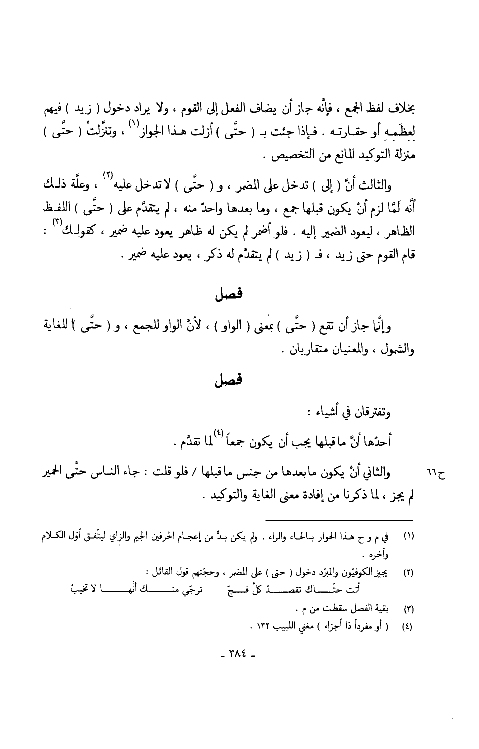 بِخِلَاف لفظ الْجمع فإنَّهُ جَازَ أَن يُضَاف الْفِعْل إِلَى الْقَوْم وَلَا يُرَاد دُخُول (زيد) فيهم لِعِظَمِهِ أَو حقارته فَإِذا جِئْت ب (حتَّى) أزلَّت هَذَا الْجَوَاز وتنزَّلتْ (حتَّى) منزلَة التوكيد الْمَانِع من التَّخْصِيص وَالثَّالِث أنَّ (إِلَى) تدخل على الْمُضمر و (حتَّى) لَا تدخل عَلَيْهِ وعلَّة ذَلِك أنَّه لمَّا لزم أنَّ يكون قبلهَا جمع وَمَا بعْدهَا واحدٌ مِنْهُ لم يتقدَّم على (حتَّى) اللَّفْظ الظَّاهِر ليعود الضَّمِير إِلَيْهِ فَلَمَّا أضمر لم يكن لَهُ ظَاهر يعود عَلَيْهِ ضمير كَقَوْلِك قَامَ الْقَوْم حَتَّى زيد ف (زيد) لم يتقدَّم لَهُ ذكر يعود عَلَيْهِ ضمير