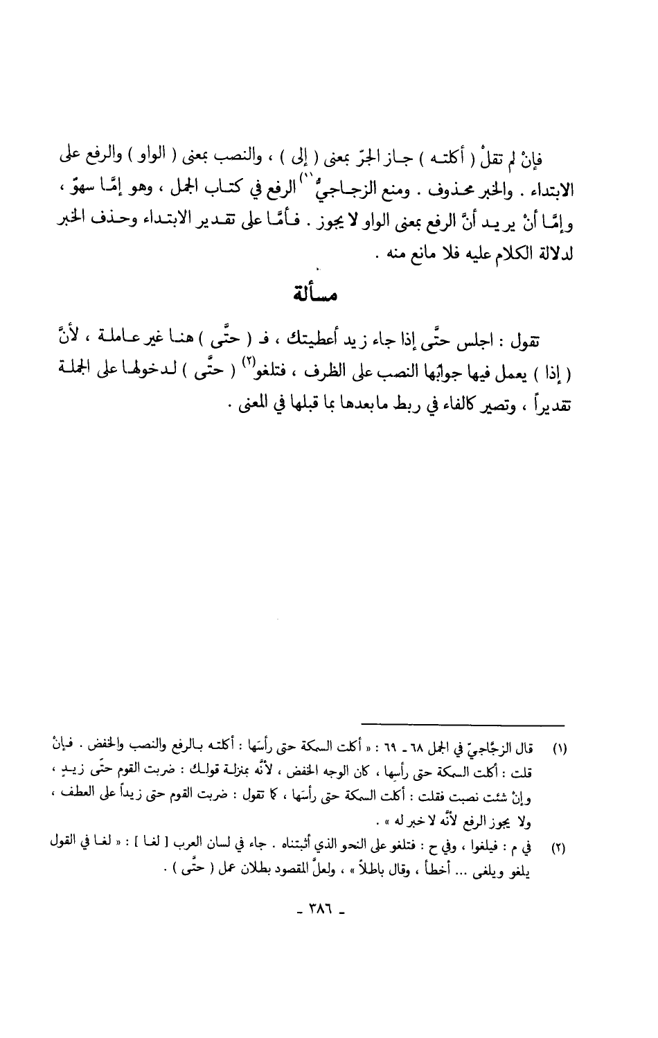 فإنْ لم تقلْ (أَكلته) جَازَ الجرّ بِمَعْنى (إِلَى) وَالنّصب بِمَعْنى (الْوَاو) وَالرَّفْع على الإبتداء وَالْخَبَر مَحْذُوف وَمنع الزجاجيُّ الرّفْع فِي كتاب الْجمل وَهُوَ إمَّا سهوٌ وإمَّا إنْ يُرِيد أَن الرّفْع بِمَعْنى الْوَاو الْوَاو لَا يجوز فأمَّا على تَقْدِير الإبتداء وَحذف الْخَبَر لدلَالَة الْكَلَام عَلَيْهِ فَلَا مَانع مِنْهُ