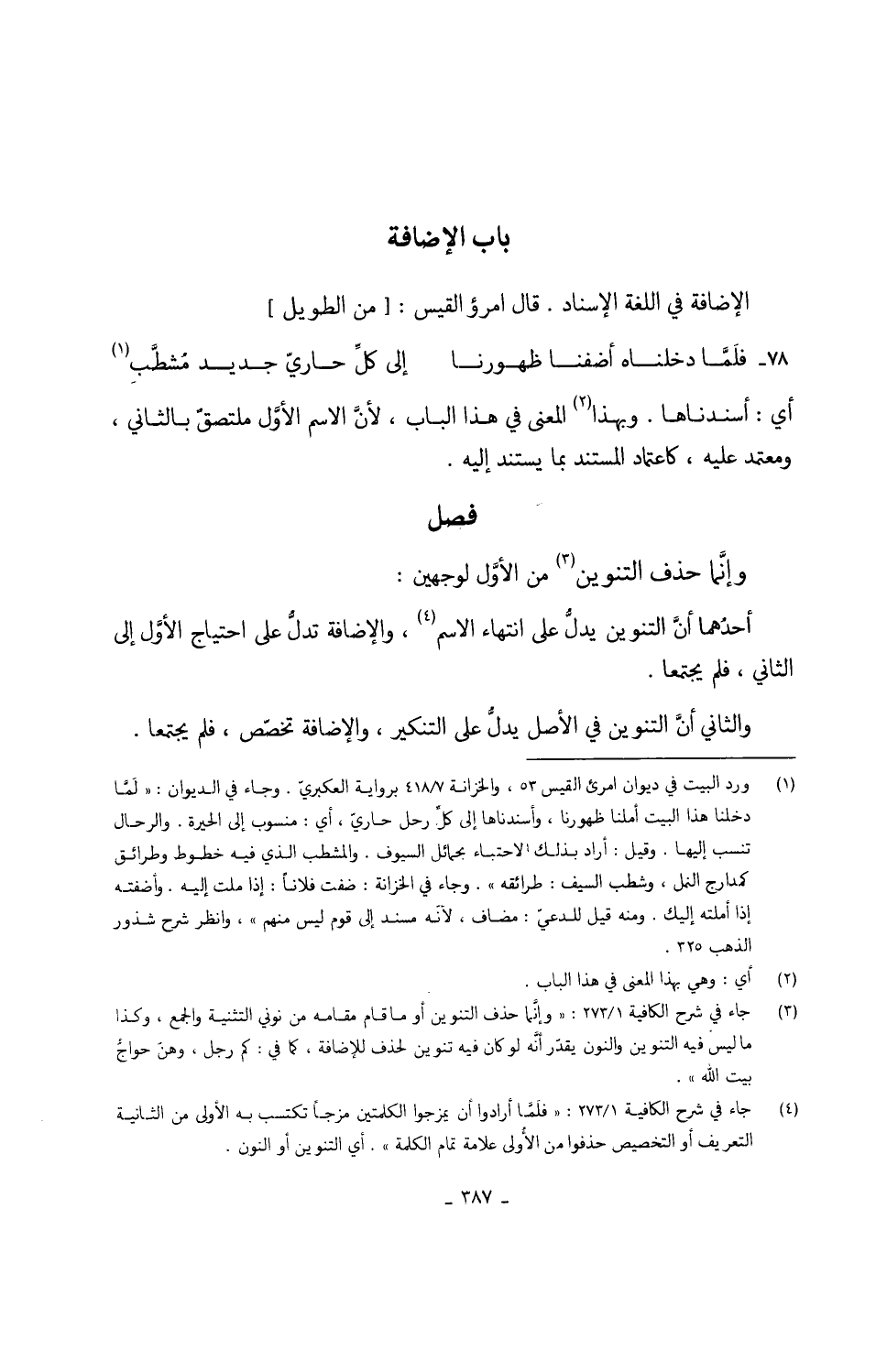 (فلَمَّا دخلناه أضفنا ظُهُورنَا ... إِلَى كل حاريّ جَدِيد مُشطَّبِ) // الطَّوِيل // أَي أسندناها وَبِهَذَا الْمَعْنى فِي هَذَا الْبَاب لأنَّ الِاسْم الأوَّل ملتصق بِالثَّانِي ومعتمد عَلَيْهِ كاعتماد الْمُسْتَند بِمَا يسْتَند إِلَيْهِ