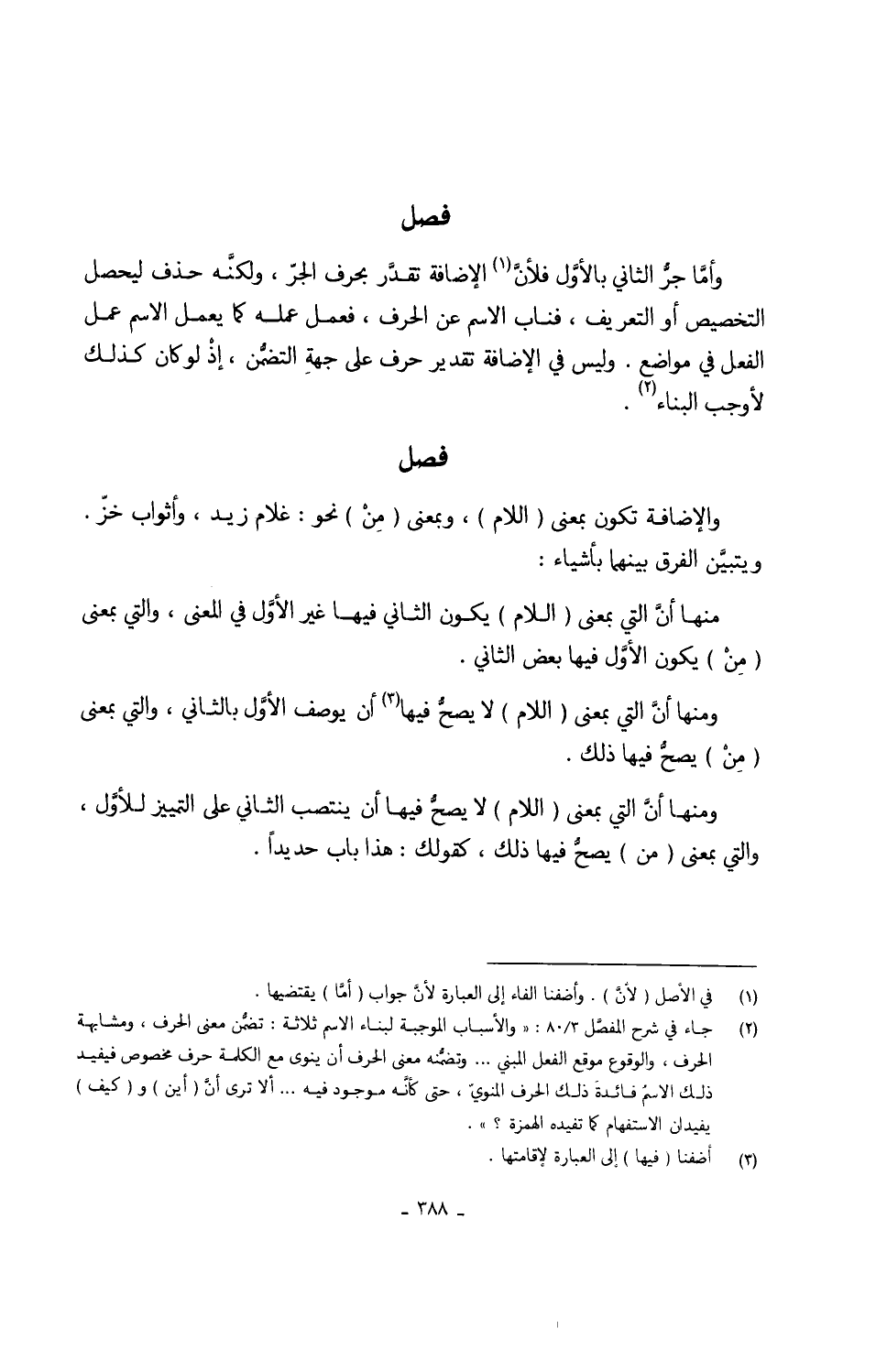 وَالْإِضَافَة تكون بِمَعْنى (اللَّام) وَبِمَعْنى (مِنْ) نَحْو غُلَام زيد وأثواب خزّ ويتبيَّن الْفرق بَينهمَا بأَشْيَاء مِنْهَا أنَّ الَّتِي بِمَعْنى (اللَّام) يكون الثَّانِي فِيهَا غير الأوَّل فِي الْمَعْنى وَالَّتِي بِمَعْنى (مِنْ) يكون الأوَّل فِيهَا بعض الثَّانِي وَمِنْهَا أنَّ الَّتِي بِمَعْنى (اللَّام) لَا يصحّ فِيهَا أنْ يُوصف الأوَّل بِالثَّانِي وَالَّتِي بِمَعْنى (مِنْ) يصحُّ فِيهَا ذَلِك وَمِنْهَا أَن الَّتِي بِمَعْنى (اللَّام) لَا يَصح فِيهَا أنْ ينْتَصب الثَّانِي على التَّمْيِيز للأوَّل وَالَّتِي بِمَعْنى (من) يصحُّ فِيهَا ذَلِك كَقَوْلِك هَذَا بَاب حديدا