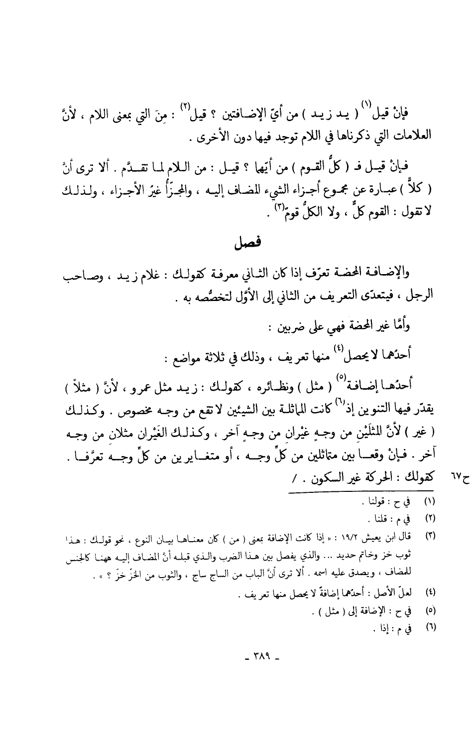 وأمَّا غير الْمَحْضَة فَهِيَ على ضَرْبَيْنِ أحدُهما لَا يحصل مِنْهَا تَعْرِيف وَذَلِكَ فِي ثَلَاثَة مَوَاضِع أحدُها إِضَافَة (مثل) ونظائره كَقَوْلِك زيد مثل عَمْرو لأنَّ (مثلا) يقدِّر فِيهَا التَّنْوِين إِذْ كَانَت الْمُمَاثلَة بَين الشَّيْئَيْنِ لَا تقع من وَجه مَخْصُوص وَكَذَلِكَ (غير) لأنَّ المثلَيْنِ من وَجه غيران من وجهٍ آخر وَكَذَلِكَ الغَيْران مثلان من وَجه آخر فإنْ وَقعا بَين متماثلين من كلِّ وَجه أَو متغايرين من كلِّ وَجه تعرَّفا كَقَوْلِك الْحَرَكَة غير السّكُون /