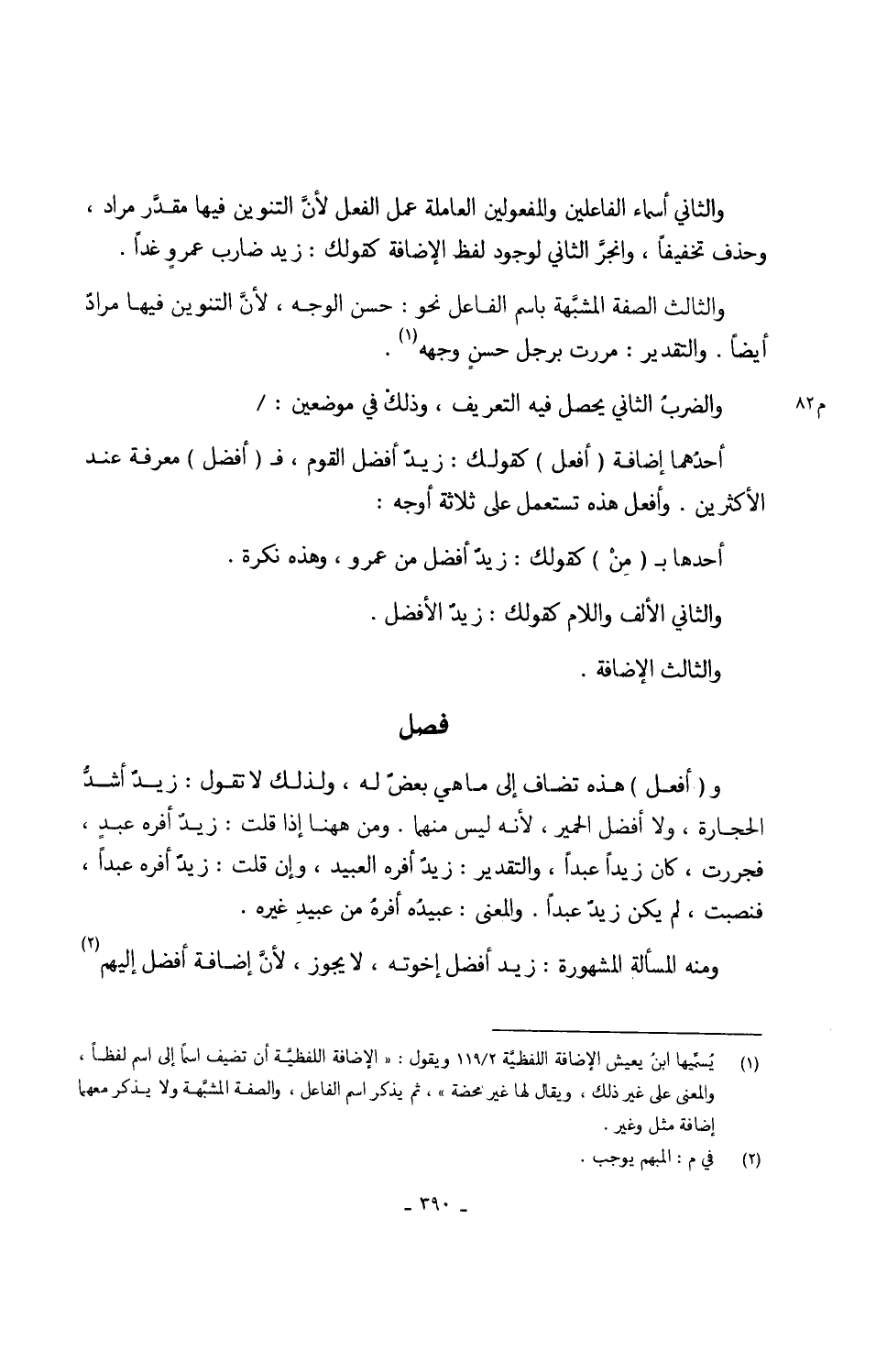 وَالثَّانِي أَسمَاء الفاعلين والمفعولين العاملة عمل الْفِعْل لأنَّ التَّنْوِين فِيهَا مقدَّر مُرَاد وَحذف تَخْفِيفًا وانجرَّ الثَّانِي لوُجُود لفظ الْإِضَافَة كَقَوْلِك زيد ضَارب عمروٍ غَدا وَالثَّالِث الصّفة المشبهة باسم الْفَاعِل نَحْو حسن الْوَجْه لأنَّ التَّنْوِين فِيهَا مُرَاد أَيْضا وَالتَّقْدِير مَرَرْت بِرَجُل حسنٍ وَجهه وَالضَّرْب الثَّانِي يحصل فِيهِ التَّعْرِيف وذلكْ فِي موضِعين أحدُهما إِضَافَة (أفعل) كَقَوْلِك زيدٌ أفضل الْقَوْم ف (أفضل) معرفَة عِنْد الْأَكْثَرين وأفعل هَذِه تسْتَعْمل على ثَلَاثَة أوجه أحدُها ب (مِنْ) كَقَوْلِك زيدٌ أفضل من عَمْرو وَهَذِه نكرَة وَالثَّانِي الْألف وَاللَّام كَقَوْلِك زيد الْأَفْضَل وَالثَّالِث الْإِضَافَة