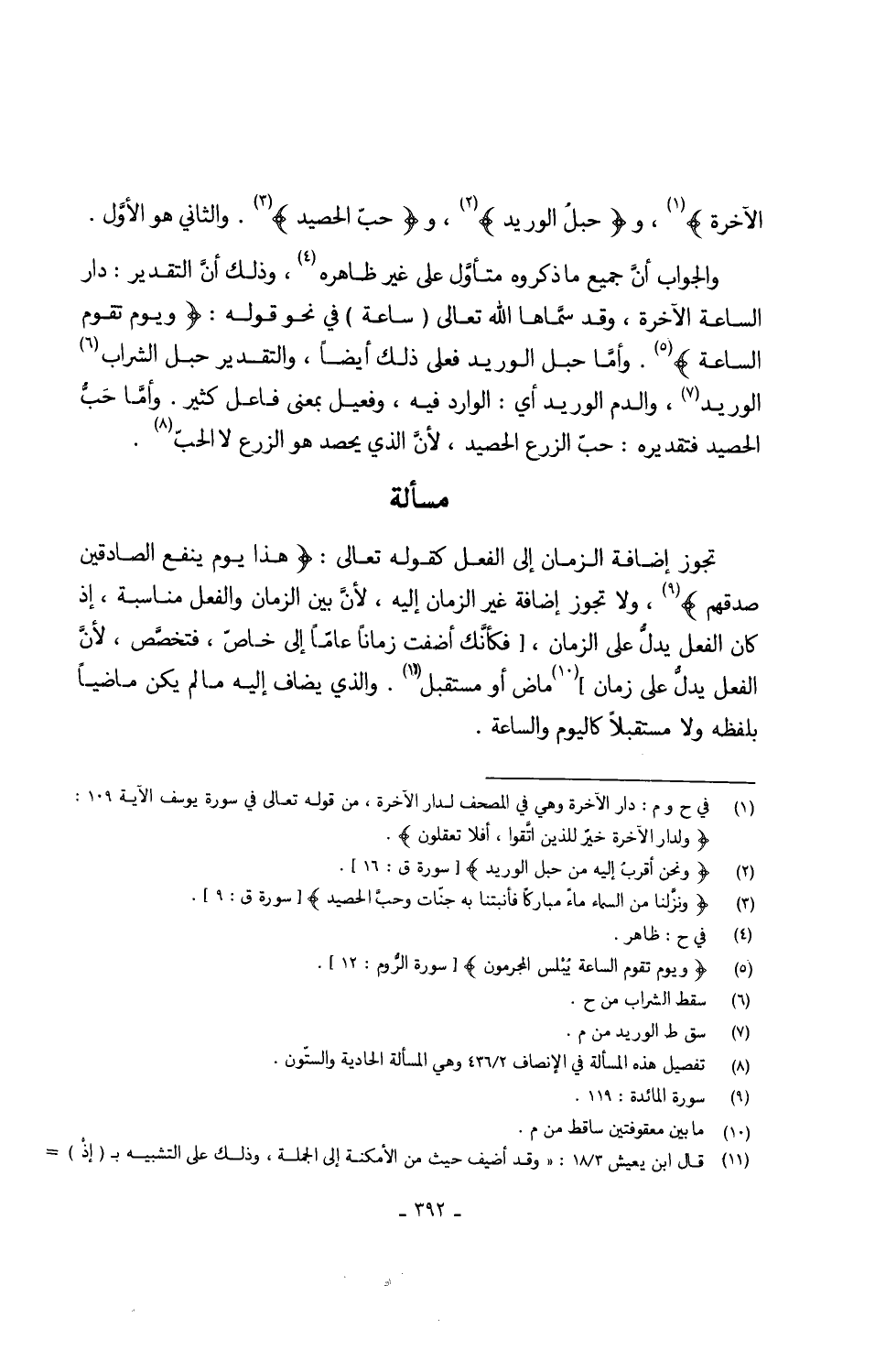 وَالْجَوَاب أنَّ جَمِيع مَا ذَكرُوهُ متأوَّل على غير ظَاهره وَذَلِكَ أنَّ التَّقْدِير دَار السَّاعَة الْآخِرَة وَقد سَمَّاهَا الله تَعَالَى (سَاعَة) فِي نَحْو قَوْله {وَيَوْم تقوم السَّاعَة} وأمَّا حَبل الوريد فعلى ذَلِك أَيْضا وَالتَّقْدِير حَبل الشَّرَاب الوريد وَالدَّم الوريد أَي الْوَارِد فِيهِ وفعيل بِمَعْنى فَاعل كثير وأمَّا حَبُّ الحصيد قتقديره حبّ الزَّرْع الحصيد لأنَّ الَّذِي يحصد هُوَ الزَّرْع لَا الحبّ