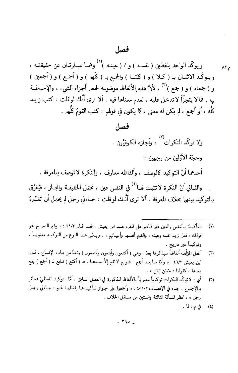 ويوكد الْوَاحِد بلفظين (نَفسه) و / (عينه) وهما عبارتان عَن حَقِيقَة ويوكد الِاثْنَان ب (كلا) و (كلتا) وَالْجمع ب (كلّهم) و (أجمع) و (أَجْمَعِينَ) و (جَمْعَاء) و (جمع) لِأَن هَذِه الْأَلْفَاظ مَوْضُوعَة لحصر أَجزَاء الشَّيْء والإحاطة بهَا فَمَا لَا يتَجَزَّأ لَا تدخل عَلَيْهِ لعدم مَعْنَاهَا فِيهِ أَلا ترى أنَّك لَو قلت كتب زيد كلُّه أَو أجمع لم يكن لَهُ معنى كَمَا يكون فِي قَوْلهم كتب الْقَوْم كلُّهم