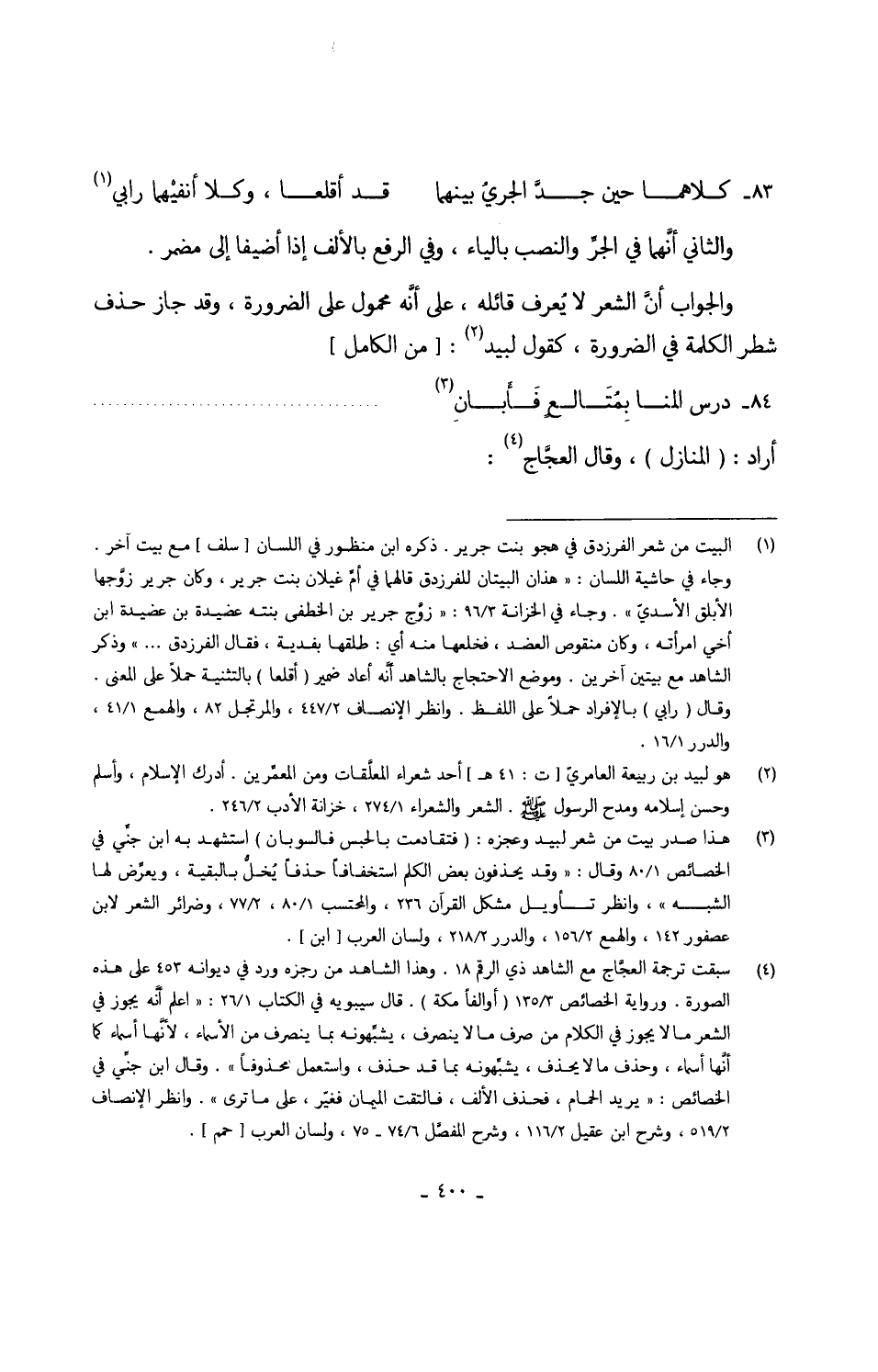 وَالْجَوَاب أنَّ الشّعْر لَا يعرفُ قائلة على أنَّه مَحْمُول على الضَّرُورَة وَقد جَازَ حذف شطر الْكَلِمَة فِي الضَّرُورَة كَقَوْل لبيد 84 -