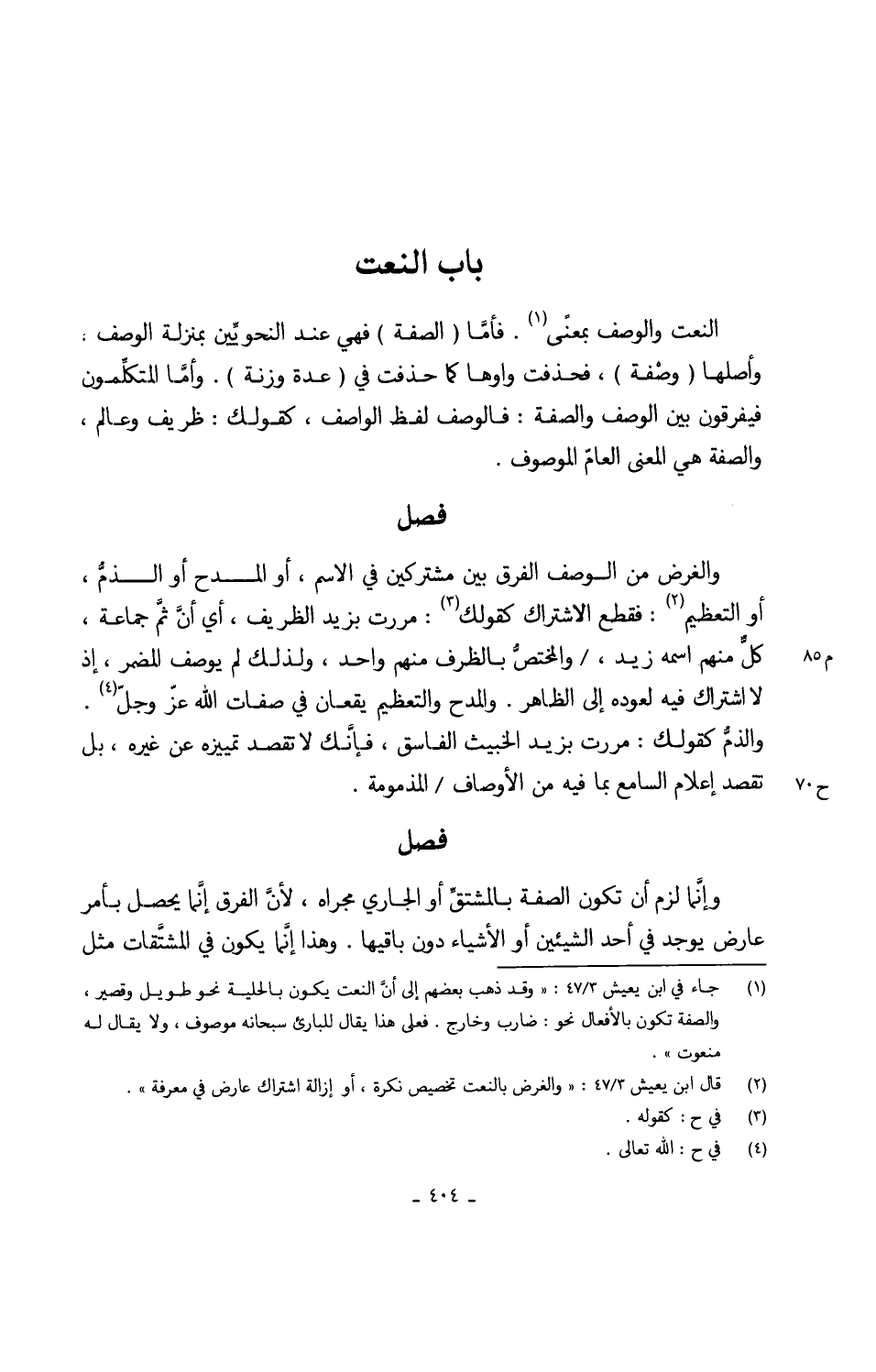 وَالْغَرَض من الْوَصْف الْفرق بَين مشتركين فِي الِاسْم أَو الْمَدْح أَو الذَّم أَو التَّعْظِيم فَقطع الِاشْتِرَاك كَقَوْلِك مَرَرْت بزيد الظريف أَي انَّ ثَّم جمَاعَة كل مِنْهُم اسْمه زيد / والمختص بالظرف مِنْهُم وَاحِد وَلذَلِك لم يُوصف المضمرإذ لَا اشْتِرَاك فِيهِ لعوده إِلَى الظَّاهِر والمدح والتعظيم يقعان فِي صِفَات الله عز وَجل والذم كَقَوْلِك مَرَرْت بزيد الْخَبيث الْفَاسِق فإنَّك لَا تقصد تَمْيِيزه عَن غَيره بل تقصد إِعْلَام السَّامع بِمَا فِيهِ من الْأَوْصَاف المذمومة