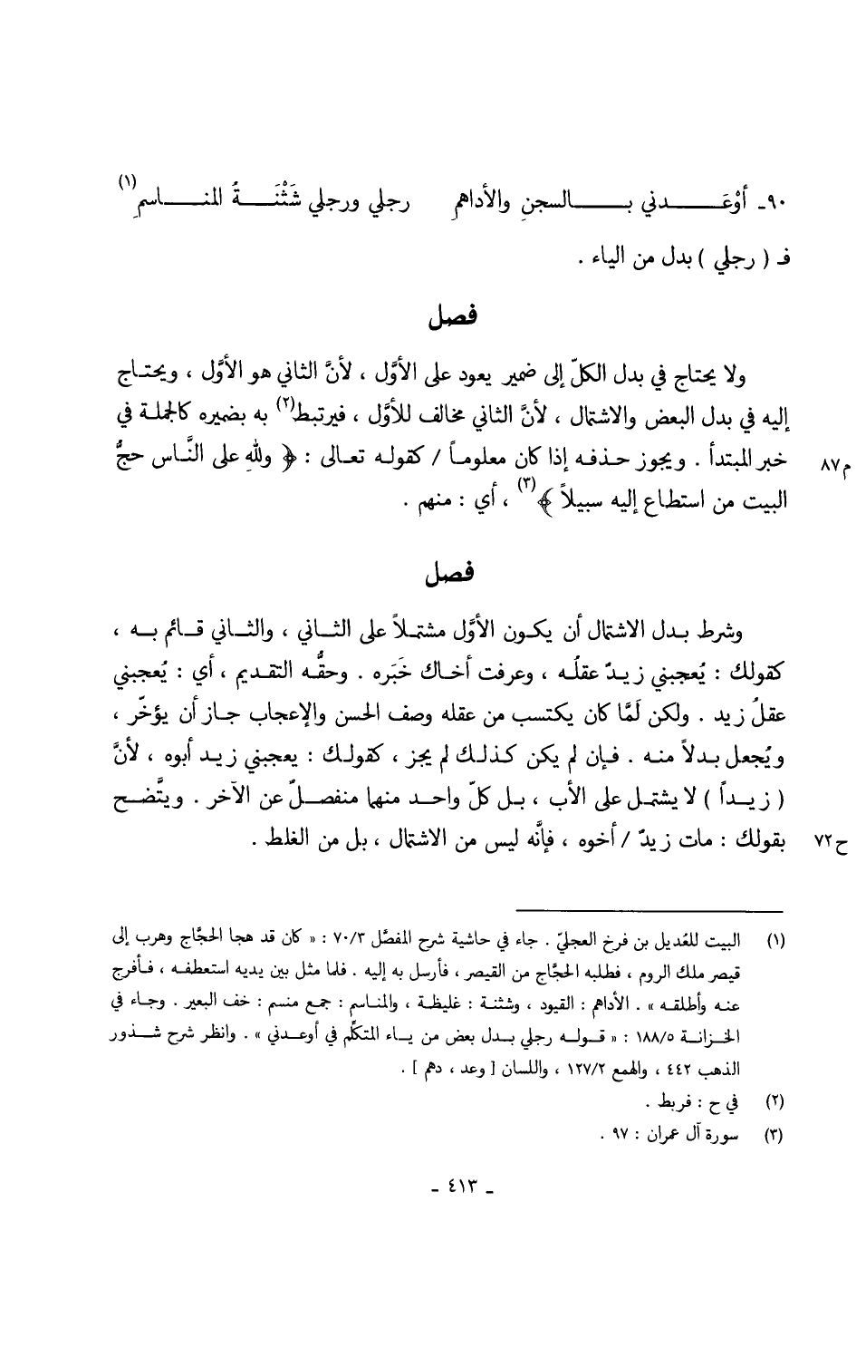 وَلَا يحْتَاج فِي بدل الْكل إِلَى ضمير يعود على الأوَّل لأنَّ الثَّانِي هُوَ الأوَّل وَيحْتَاج إِلَيْهِ فِي بدل الْبَعْض والاشتمال لأنَّ الثَّانِي مُخَالف للاوَّل فيرتبط بِهِ بضميره كالجملة فِي خبر الْمُبْتَدَأ وَيجوز حذفه إِذا كَانَ مَعْلُوما كَقَوْلِه تَعَالَى {وللهِ على النَّاس حجًّ الْبَيْت من اسْتَطَاعَ إِلَيْهِ سَبِيلا} أَي مِنْهُم
