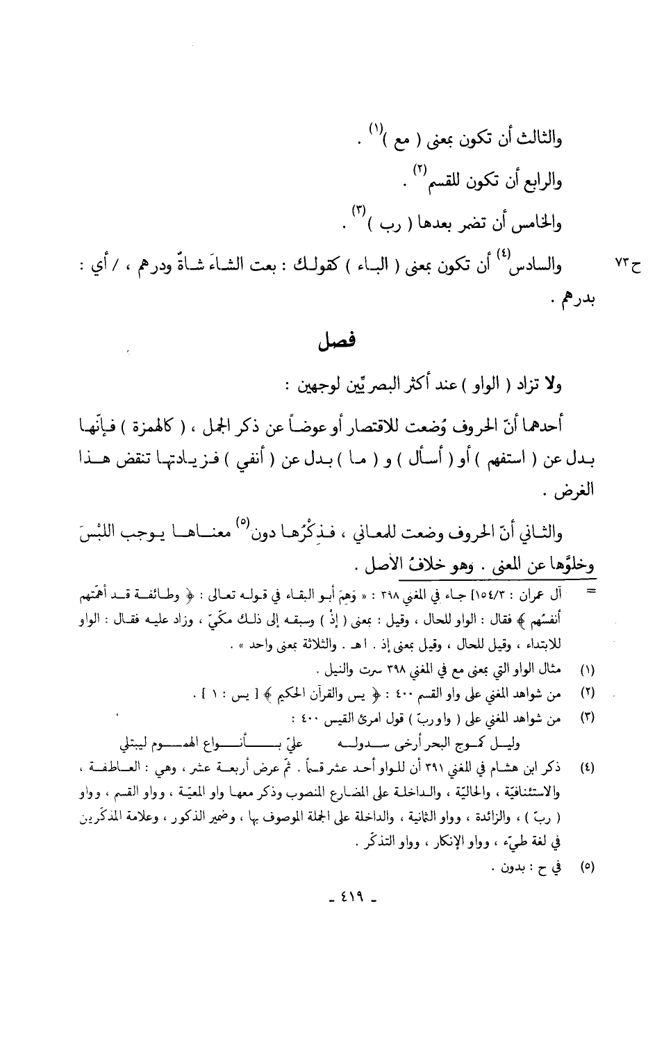 وَالثَّالِث أَن تكون بِمَعْنى (مَعَ) وَالرَّابِع ان تكون للقسم وَالْخَامِس أَن تضمر بعْدهَا (رب) وَالسَّادِس أَن تكون بِمَعْنى (الْبَاء) كَقَوْلِك بِعْت الشاءَ شاةٌ وَدِرْهَم أَي بدرهم