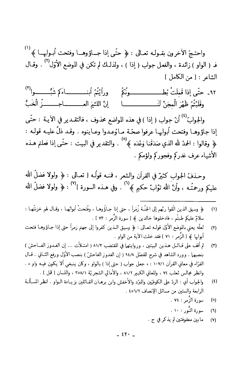 (حتّى إِذا قَملِتْ بطونُكُم ... ورأيتم ابناءكم شبَّوا) وقَلبْتُم ظِهْرِ المِجْنّ لنا ... إِن اللَّئِيم الْعَاجِز الخبَّ) // الْكَامِل // وَالْجَوَاب أنْ جَوَاب (إِذا) فِي هَذِه الْمَوَاضِع مَحْذُوف فالتقدير فِي الْآيَة حتّى إِذا جاؤوها وَفتحت أَبْوَابهَا عرفُوا صحّة وَمَا وُعدوا وعاينوه وقدّ دلّ عَلَيْهِ قَوْله تَعَالَى {وَقَالُوا الحمدُ لله الَّذِي صَدَقَنا وَعدْهَ} وَالتَّقْدِير فِي الْبَيْت حَتَّى إِذا فَعلْتُمْ هَذِه الْأَشْيَاء عرف غدركم وفجوركم ولؤمكم