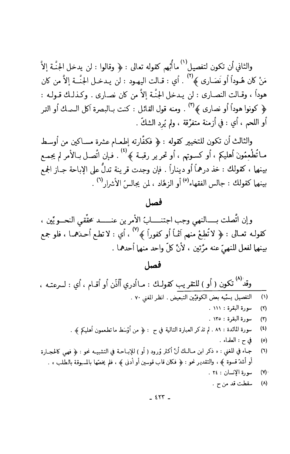 وَالثَّانِي أَن تكون لتفصيل مَا أبهم كَقَوْلِه تَعَالَى {وَقَالُوا لن يدْخل الجنَّة إلأّ مَنْ كَانَ هودا أَو نَصَارَى} أَي قَالَت الْيَهُود لن يدْخل الجنَّة من إِلَّا من كَانَ هوداً وَقَالَت النَّصَارَى لن يدْخل الْجنَّة إِلَّا من كَانَ نَصَارَى وَكَذَلِكَ قَوْله تَعَالَى {كونُوا هودا أَو نَصَارَى} وَمِنْه قَول الْقَائِل كنت بِالْبَصْرَةِ آكل السّمك أَو التَّمْر أَو اللَّحْم أَي فِي أزمنه مُتَفَرِّقَة وَلم يرد الشَّك وَالثَّالِث أَن تكون للتَّخْيِير كَقَوْلِه {فكّفارته إطْعَام عشرَة مَسَاكِين من أَوسط مَا تُطْعِمُونَ أهليكم أَو كسوتهم أَو تَحْرِير رَقَبَة} فلإن اتّصل بِالْأَمر لم يجمع بَينهمَا كَقَوْلِك خُذ درهما أَو دِينَارا فَإِن وجدت قرينَة تدل على الْإِبَاحَة جَازَ الْجمع بَينهمَا كَقَوْلِك جَالس الْفُقَهَاء أَو الزَّهاد لمن يجالسُ الأشرار