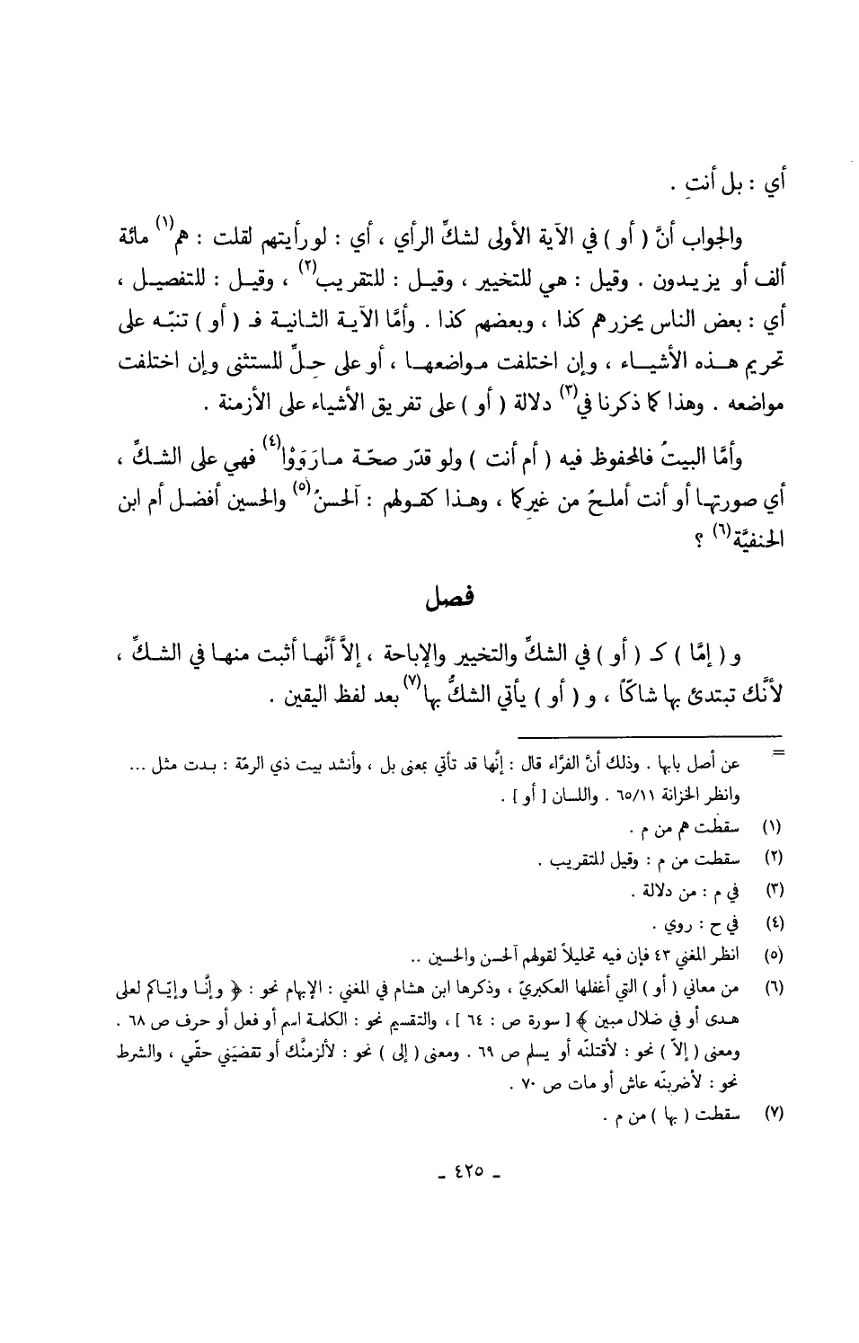 وَالْجَوَاب أنَّ (أَو) فِي الْآيَة الأولى لشكّ الرَّأْي أَي لَو رَأَيْتهمْ لَقلت هم مائَة ألف أَو يزِيدُونَ ة وَقيل هِيَ للتَّخْيِير وَقيل للتقريب وَقيل للتفصيل أَي بعض النَّاس يجزرهم كَذَا وَبَعْضهمْ كَذَا وأمَّا الْآيَة الثَّانِيَة ف (أَو) تنبّه على تَحْرِيم هَذِه الْأَشْيَاء وإنّ اخْتلفت موَاضعهَا أَو على حلَّ الْمُسْتَثْنى وَإِن اخْتلفت موَاضعه وَهَذَا كَمَا ذكرنَا فِي دلَالَة (أَو) على تَفْرِيق الْأَشْيَاء على الْأَزْمِنَة وأمَّا الْبَيْت فالمحفوُظ فِيهِ (أم أَنْت) وَلَو قدّر صحّة مَا رَوَوْا فَهِيَ على الشكّ أَي صورتهَا أَو أَنْت أملحُ من غيركما وَلِهَذَا كَقَوْلِهِم الْحسن وَالْحُسَيْن أفضل أم ابْن الْحَنَفِيَّة