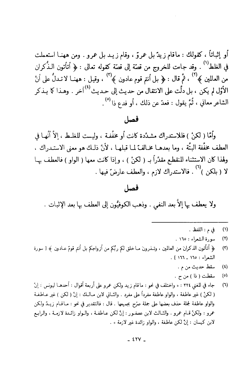 أَو إِثْبَاتًا كَقَوْلِك مَا قَامَ زيدٌ بل عمروٌ وَقَامَ زيد بل عَمْرو وَمن هُنَا اسْتعْملت فِي الْغَلَط وَقد جَاءَت لِلْخُرُوجِ من قصّة إِلَى قصَّة كَقَوْلِه تَعَالَى {أتأتون الذُّكران من الْعَالمين} ثَّم قَالَ {بل أَنْتُم قوم عادون} ) وَقيل هَهُنَا لَا تدلَّ على أنَّ الأوَّل لم يكن بل دلَّت على الِانْتِقَال من حَدِيث إِلَى حَدِيث آخر وَهَذَا كَمَا يذكر الشَّاعِر مَعَاني ثُمَّ يَقُول فعد عَن ذَلِك أَو فدع ذَا